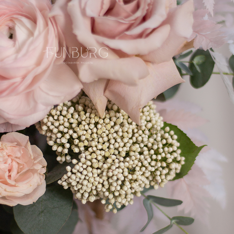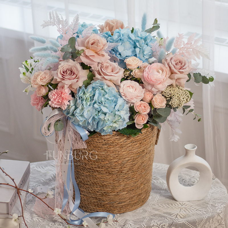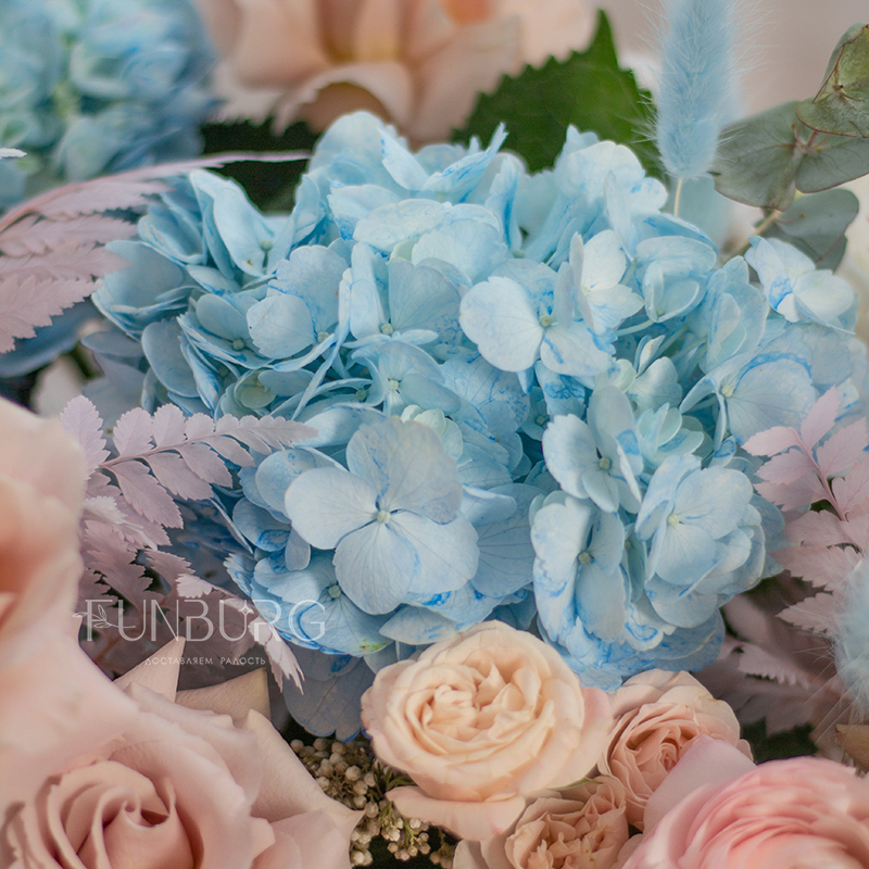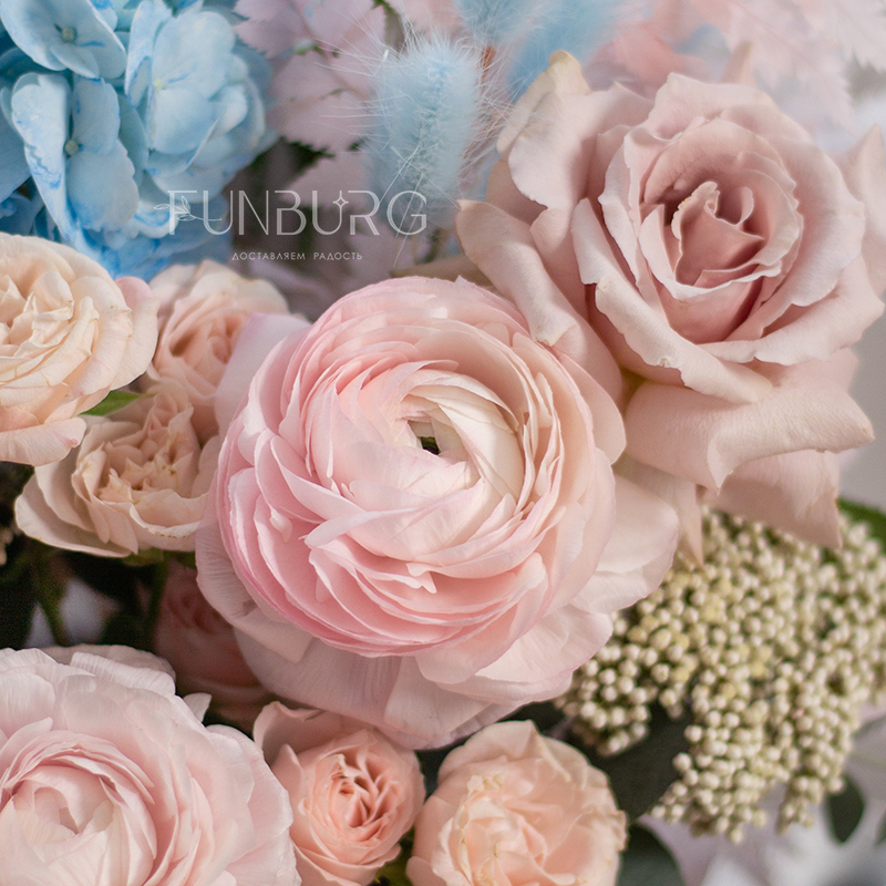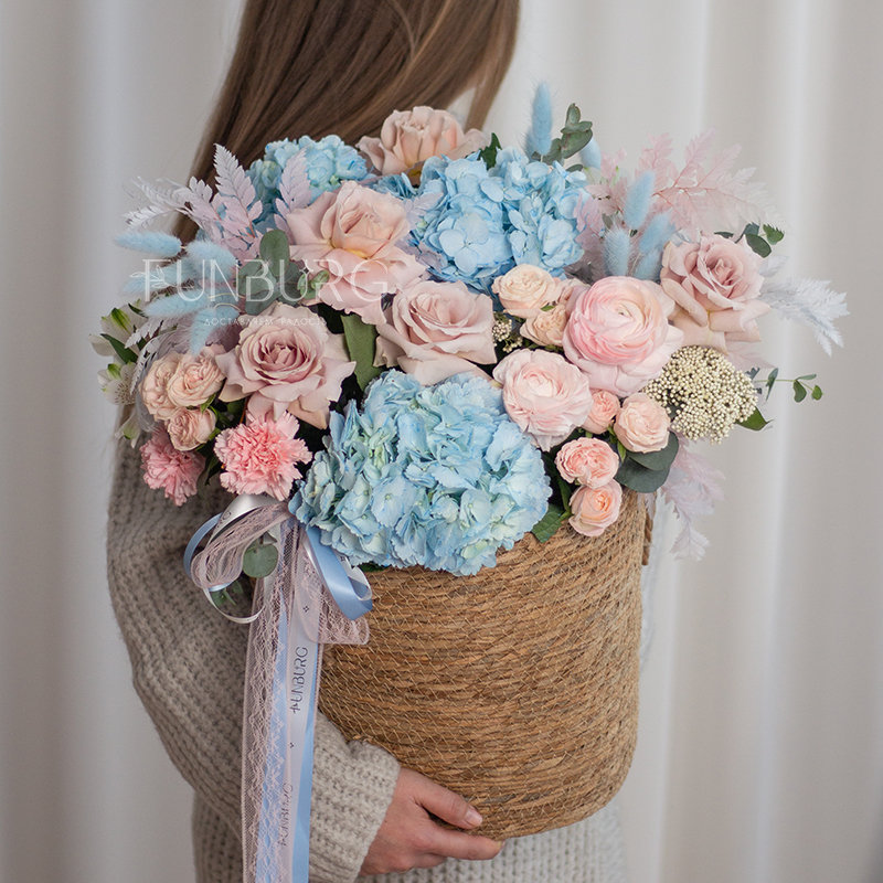 Умопомрачительная корзина с нежными ранункулюсами, небесно-голубой гортензией, пыльно-розовыми сортовыми и пионовидными розами, кружевным диантусом и фактурными сухоцветами.
