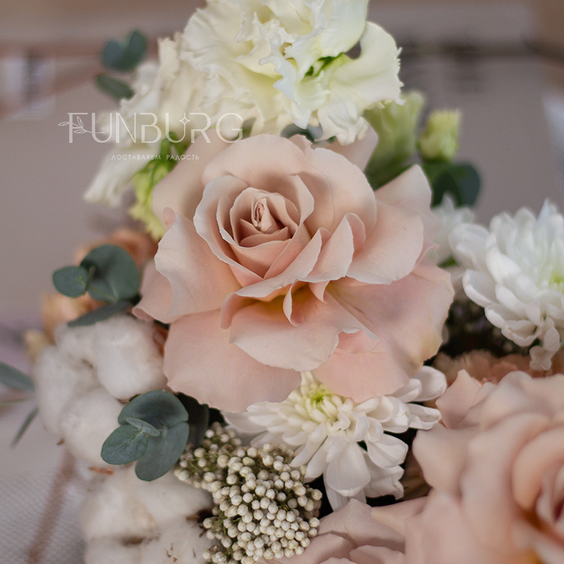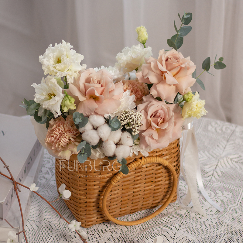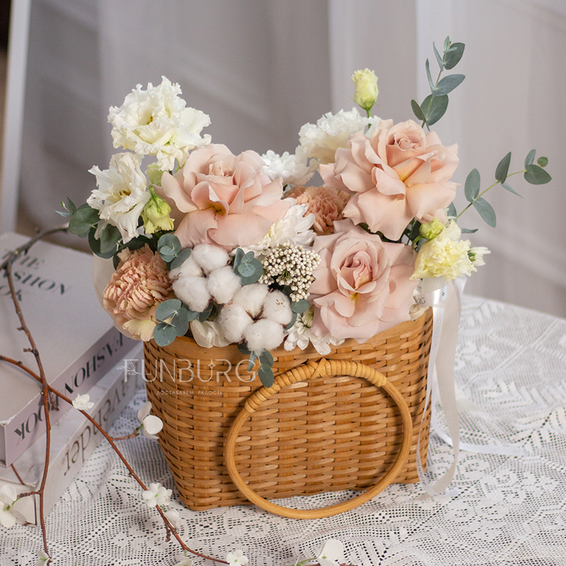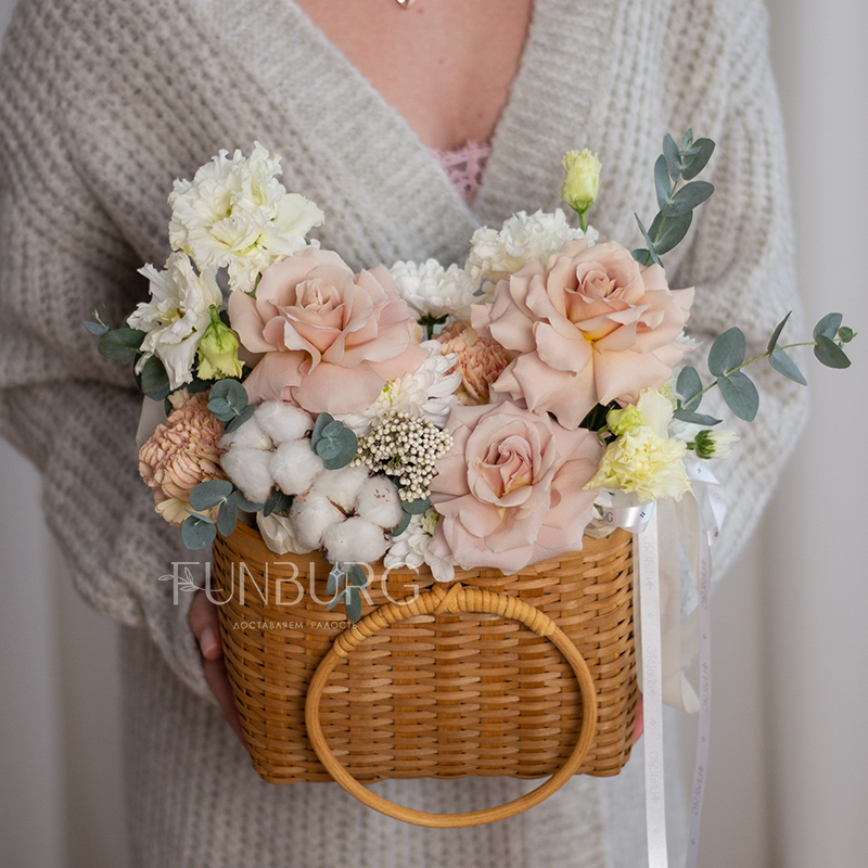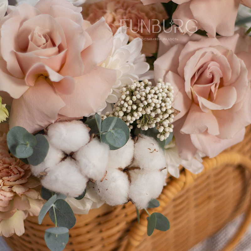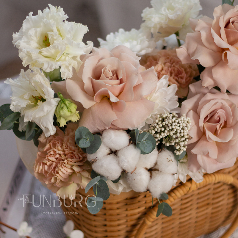 Нежная корзина в теплых сливочных какао оттенках с волшебными розами Quicksand, кружевной эустомой и мягким хлопком.