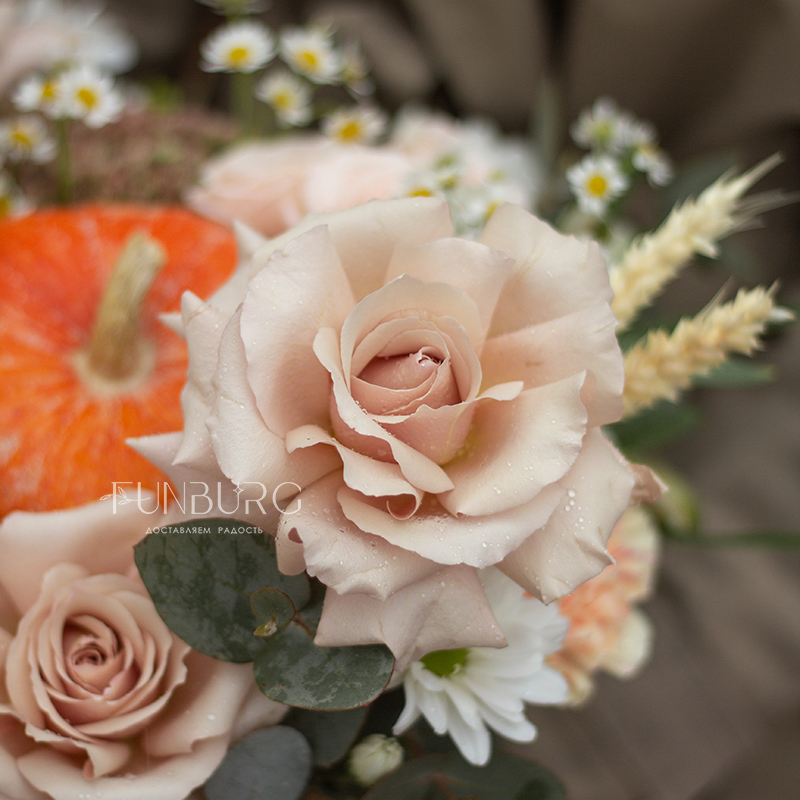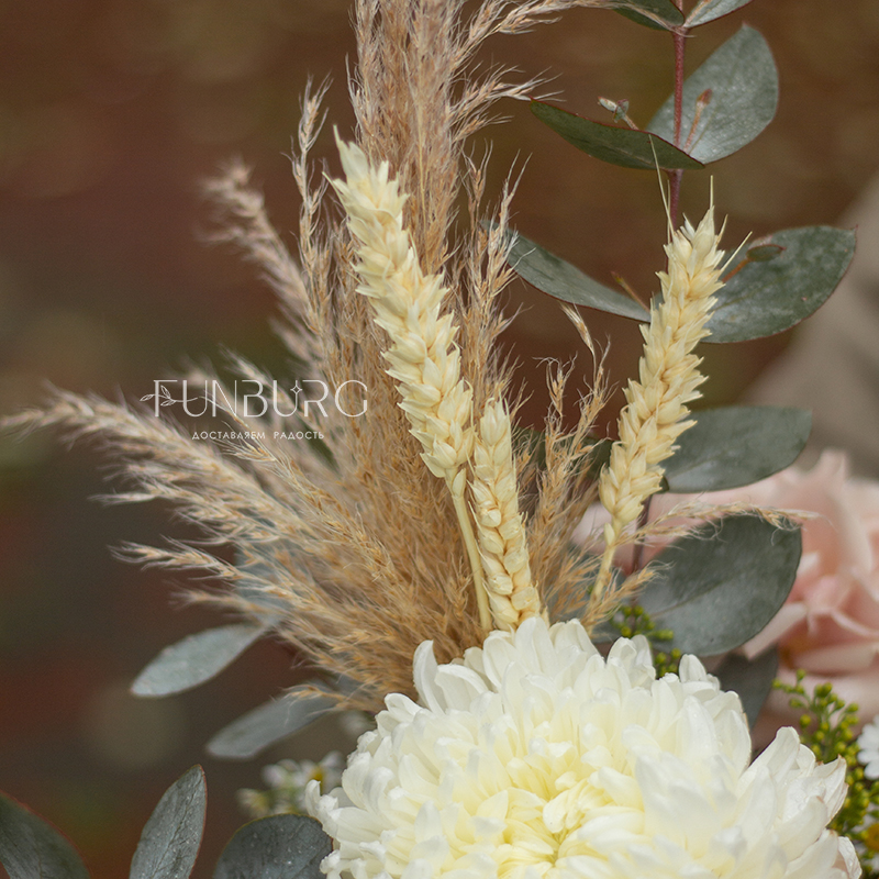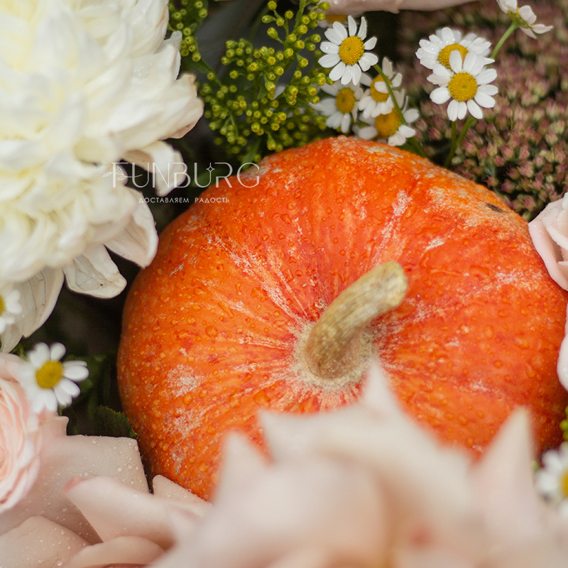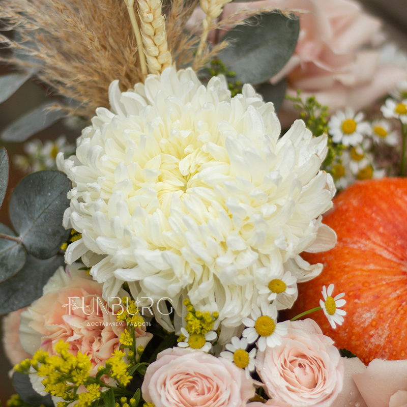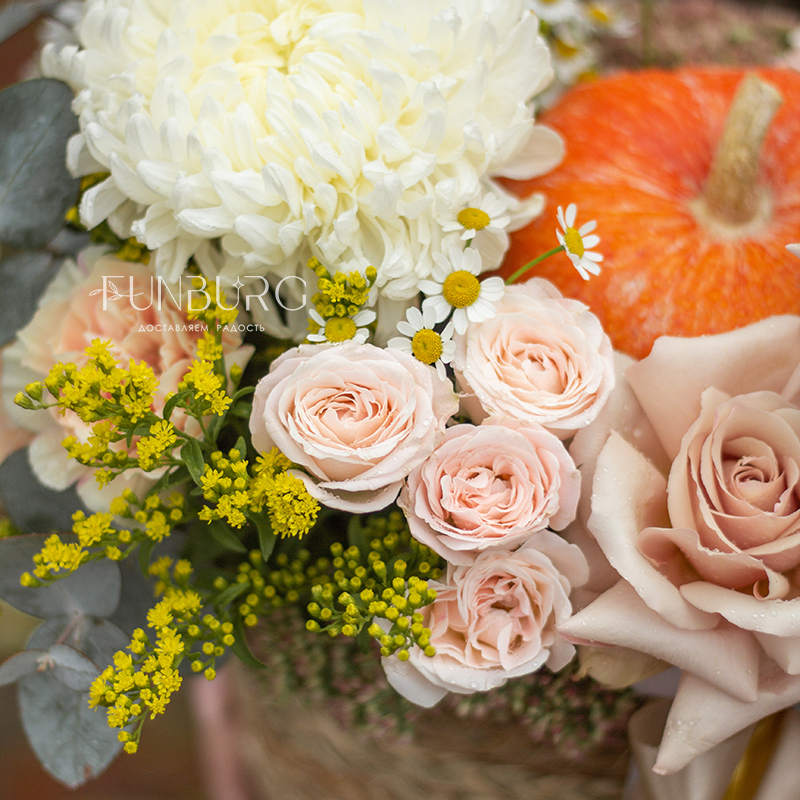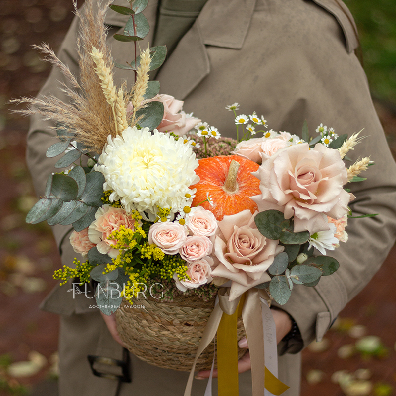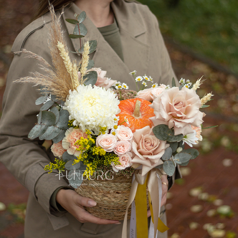 Нежная осенняя корзина в теплых кремовых оттенках с добавлением тыквы и сухоцветов создана дарить уютное осеннее настроение