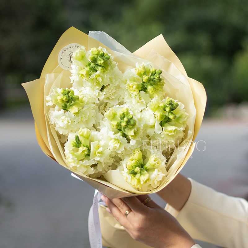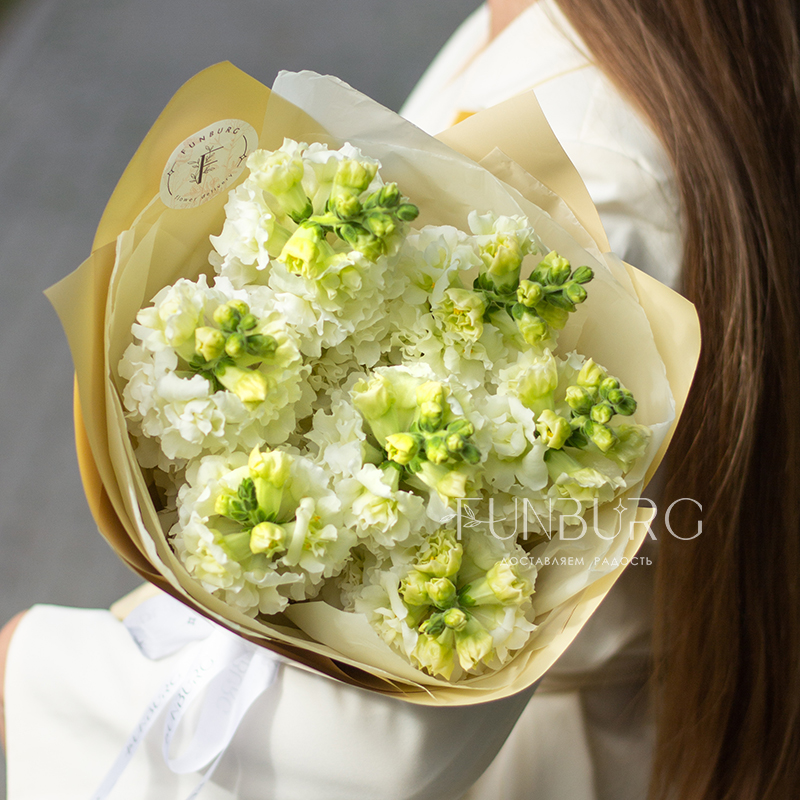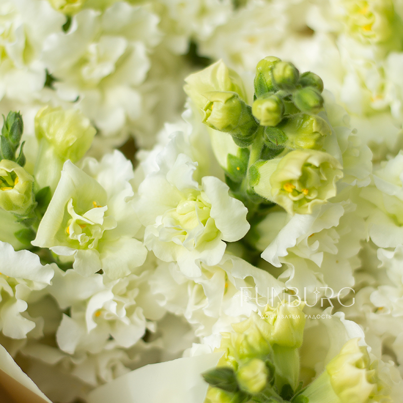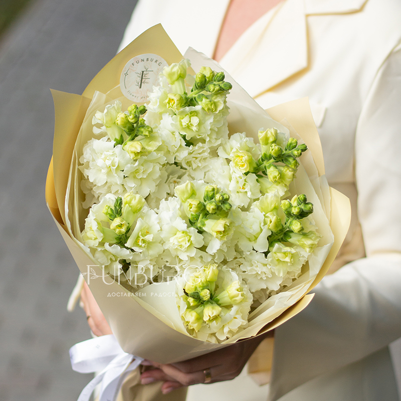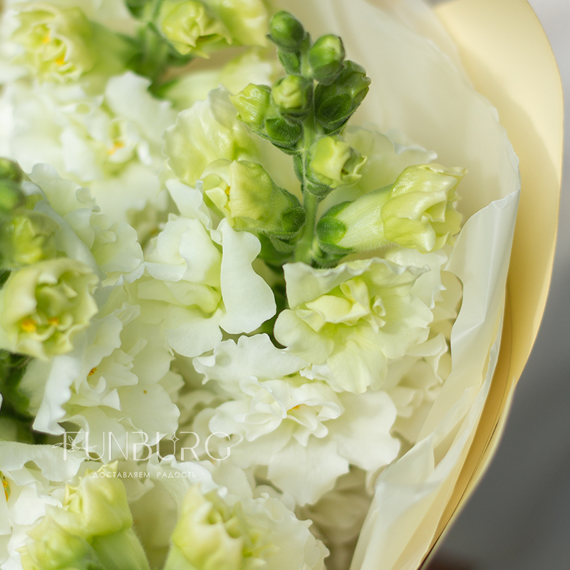 Букет необычайно ароматного белоснежного антирринума в объятиях нежной кремовой упаковки. Идеально для самых летних цветочных сюрпризов.