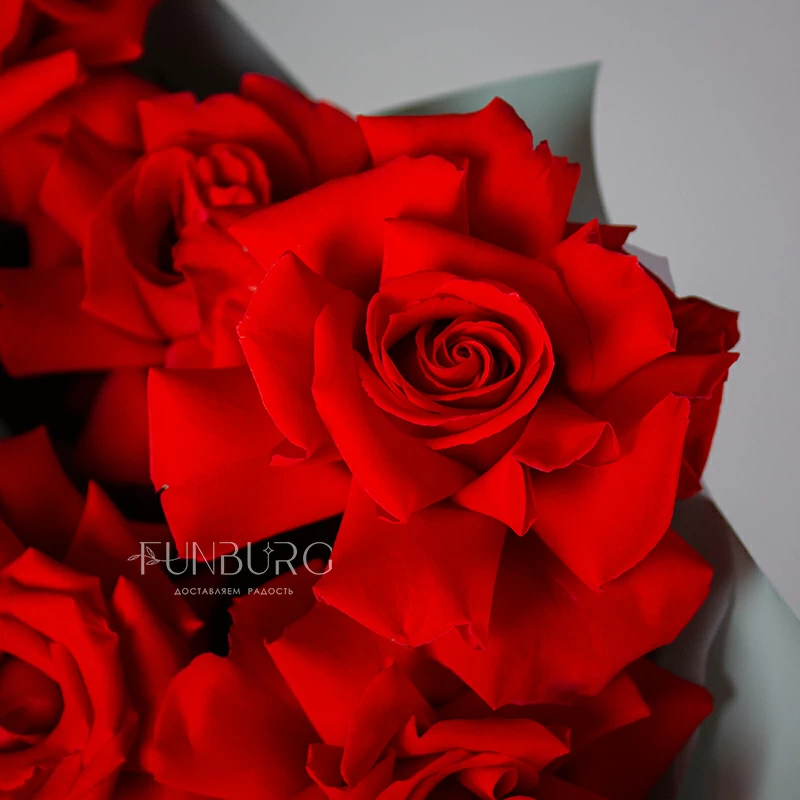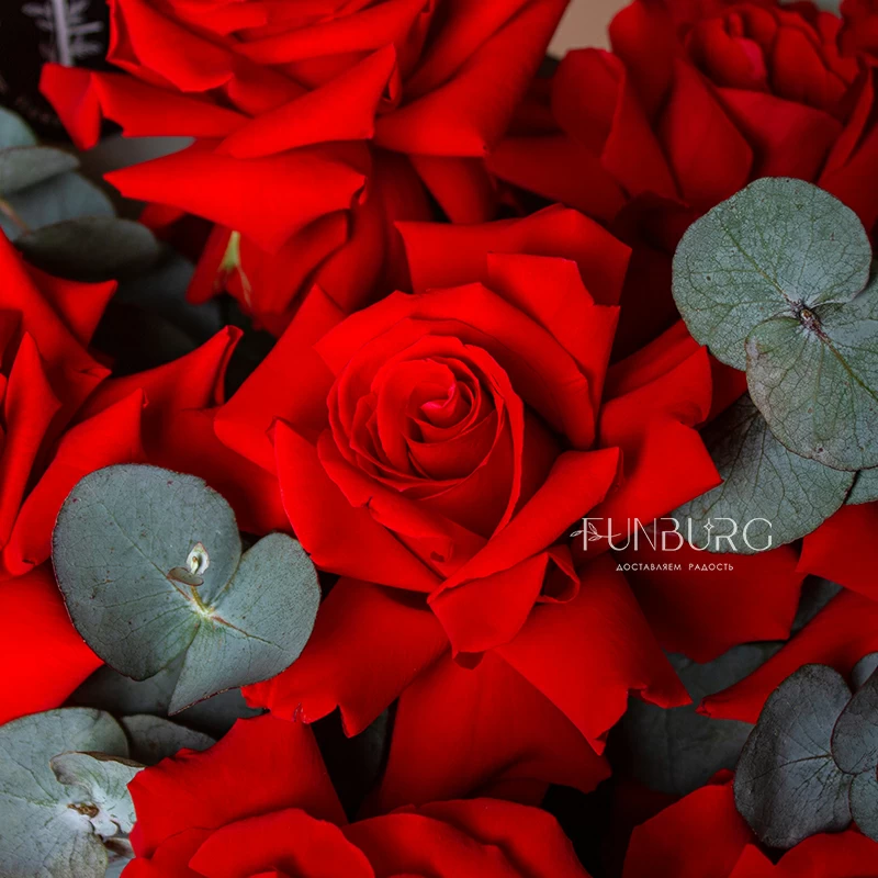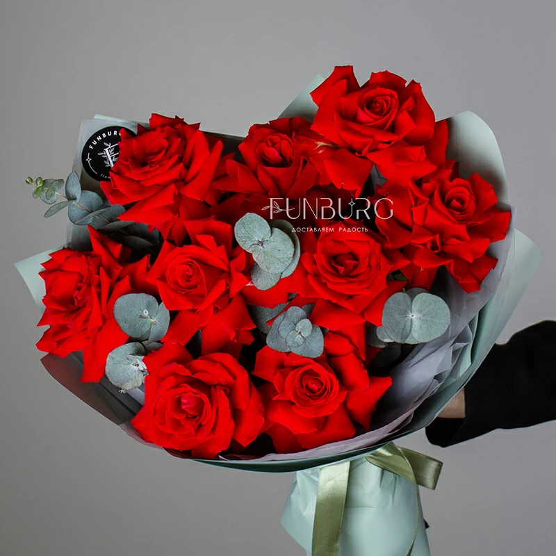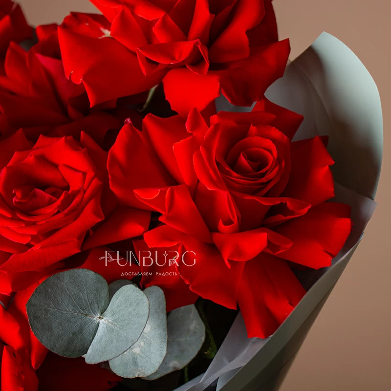 Пышный букет из идеальных алых сортовые роз сорта Nina с крупными бутонами ярко-красного цвета, дополненных серебристым эвкалиптом в оттеняющей цветы упаковке. Идеальный букет, чтобы удивить и порадовать самого дорогого человека!