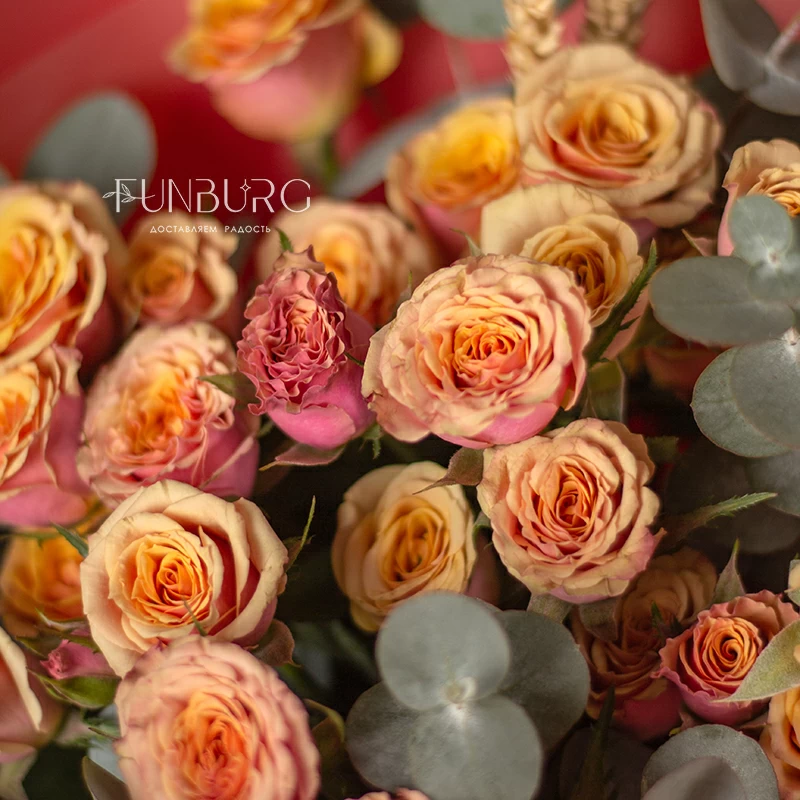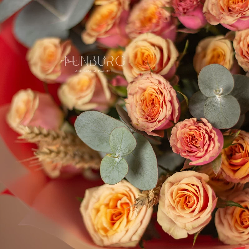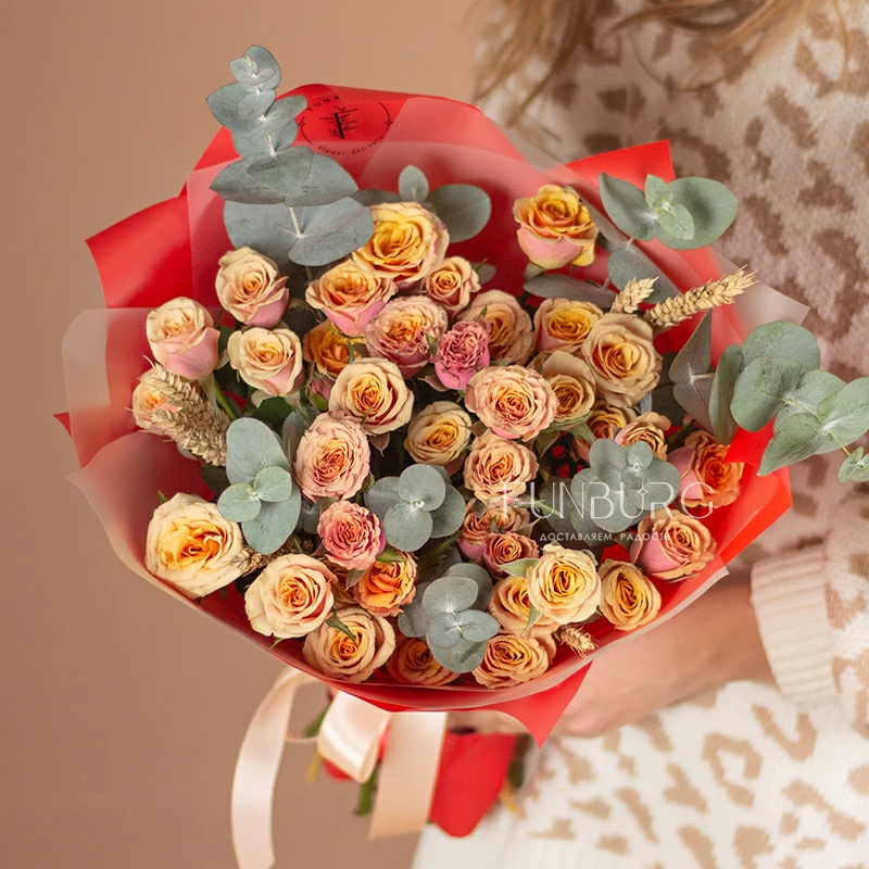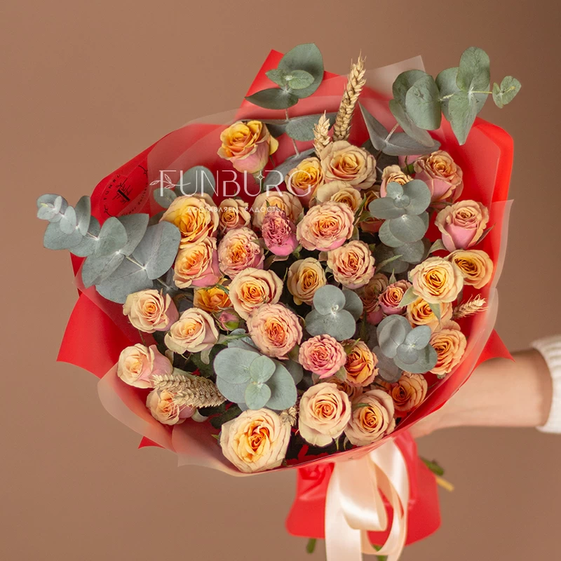 Эффектный монобукет из кустовых роз сложных красивых оттенков закатного неба, дополненных сухоцветами и лаконичной упаковкой, оттеняющей цвет бутонов.