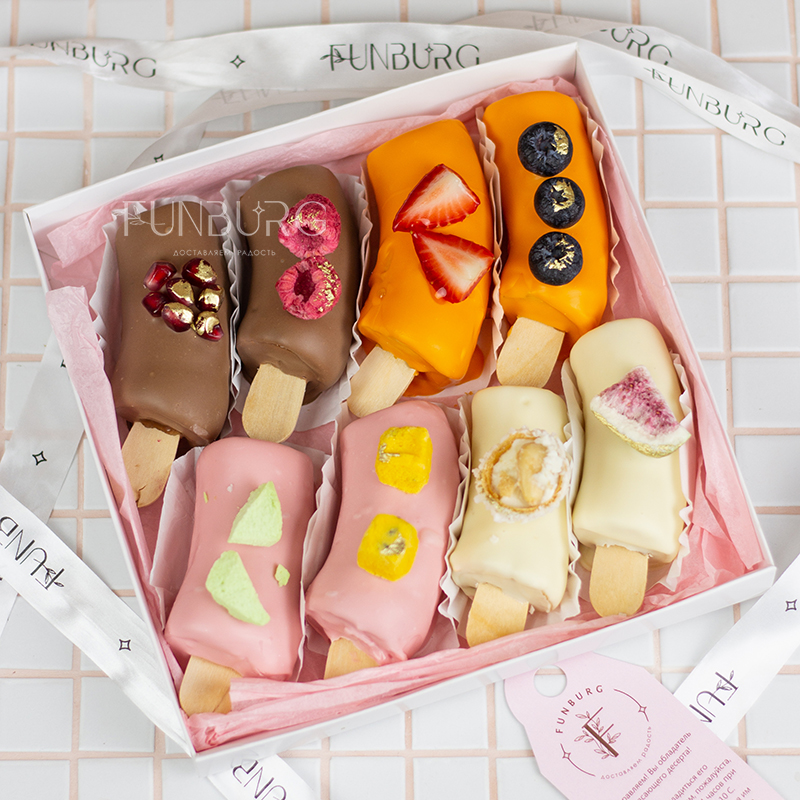 Идеальное сочетание нежной кремовой текстуры сладкого банана и слегка хрустящей оболочки из белого, клубничного, апельсинового и молочного шоколада! Этот бесподобный десерт мы дополнили сублимированным мороженым, сублимированными инжиром, маракуйей, свежей клубникой, гранатом, голубикой. Сладкая фруктовая классика в необычном красивом прочтении станет отличным дополнением к основному подарку или букету цветов.