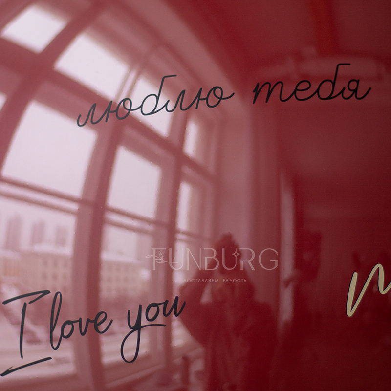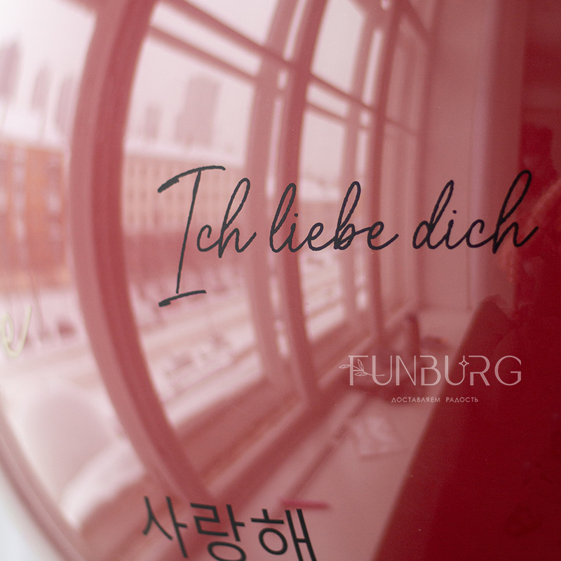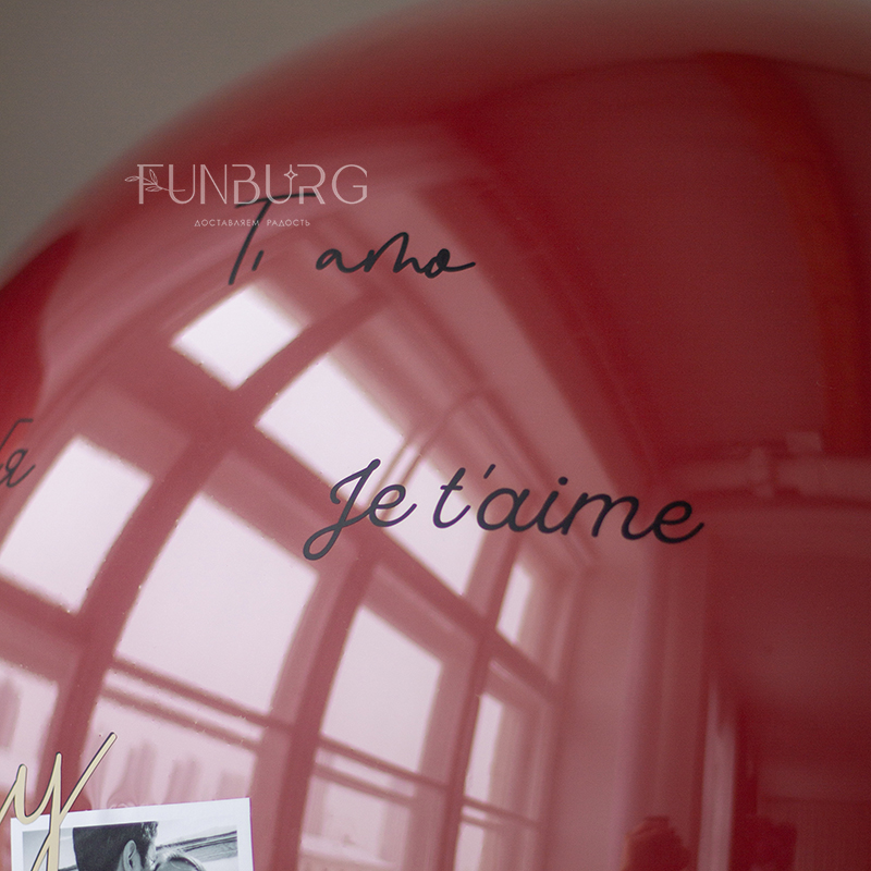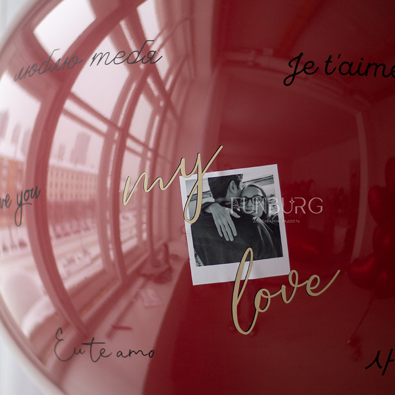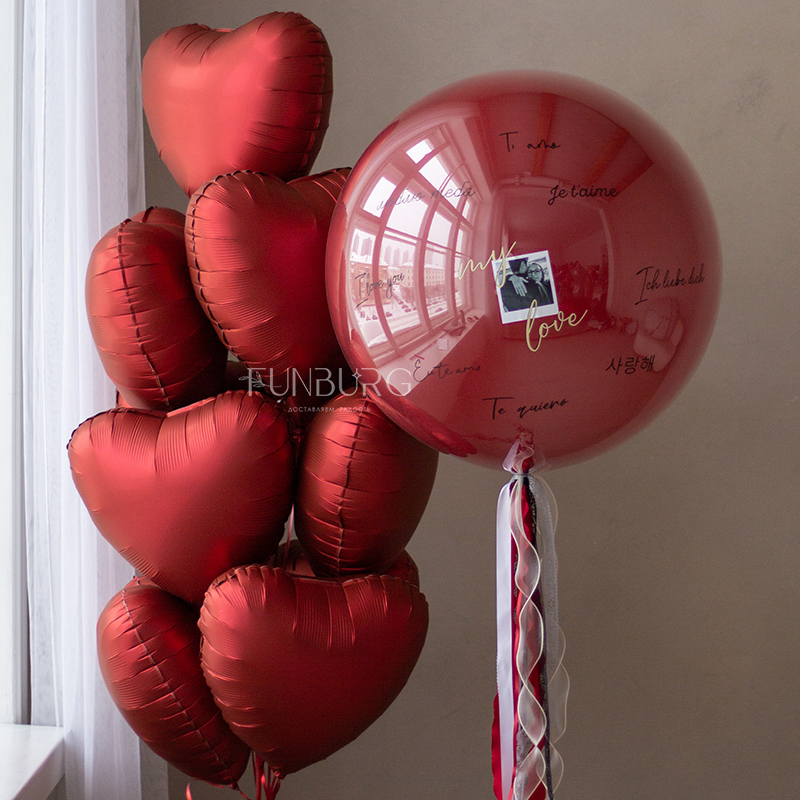 Большой зеркально-глянцевый шар насыщенного красного оттенка с вашей фотографией (ее нужно будет прислать нам на почту mail@funburg.ru), надписью "я люблю тебя" на разных языках мира, шлейфом из ленточек как нельзя лучше передаст силу, безграничность и глубину ваших чувств. Шар мы дополнили лаконичной красивой связкой из красных сатиновых сердец, чтобы подарок был еще более приятным.