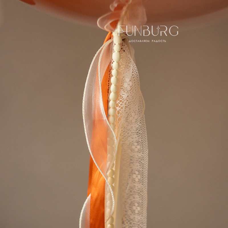 Большой зеркально-глянцевый шар насыщенного теплого оранжевого оттенка, усыпанный цветочками, с надписью с красивым орнаментом (надпись можно сделать любой) и шлейфом из ленточек мы дополнили нарядной связкой шариков в янтарно-кремовых оттенках, с сатиновыми сердечками, шаром Bubble с облачком фатина. Этот набор идеально подойдет для самых теплых поздравлений!