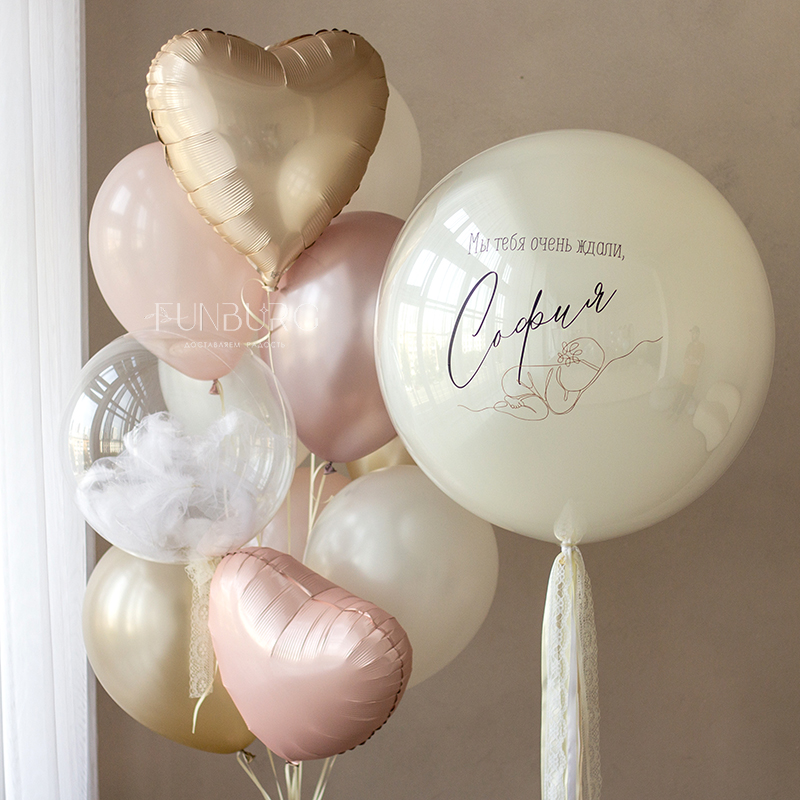 Шар мы дополнили стильной и нежной связкой из шариков сливочных, розовых и мягких золотистых оттенков, сердечек и шара Bubble с облачком фатина и перьями внутри.