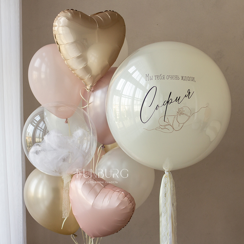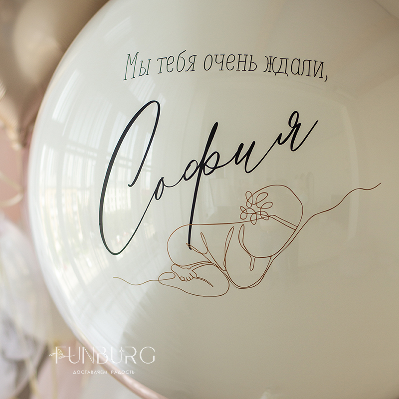 Большой зеркально-глянцевый шар нежнейшего мерцающего сливочно-белого оттенка с нежным рисунком младенца, выполненным одной линией, именем малышки, шлейфом из ленточек идеально подойдет для встречи мамы и малышки дома!