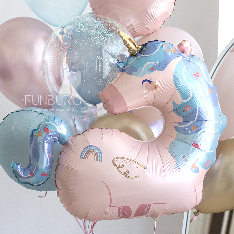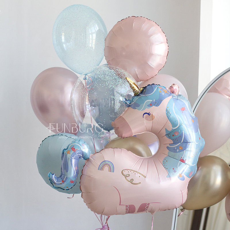 Красивый сатиновый единорог и идеально подходящая к нему связка из шариков мерцающих оттенков с шаром Bubble со сверкающим конфетти идеально подойдет для подарка любительнице единорогов и станет декором самого волшебного праздника!