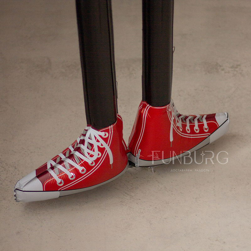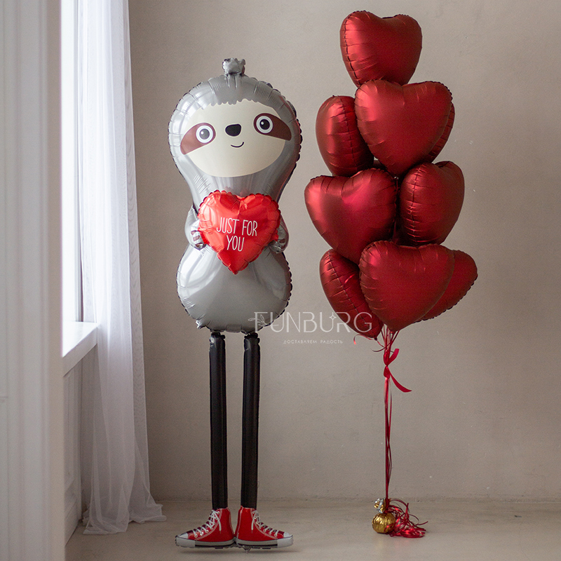 Очаровательный влюблённый ленивец в человеческий рост, с сердечком в руках и в веселых красных кедах, мечтательно стоящий, немного застенчиво улыбающийся, и иногда сам перемещающийся по полу – разве можно придумать более эффектный и милый подарок для любимых? А чтобы сделать подарок и украшения праздника еще более эффектным и трогательным, мы дополнли его связкой красных сатиновых сердечек.