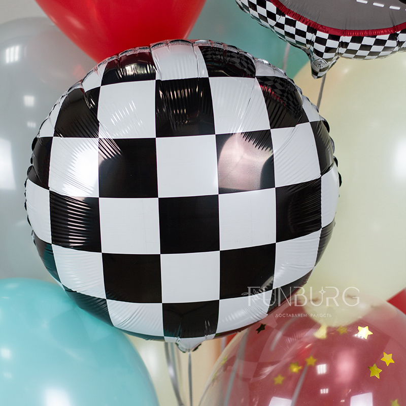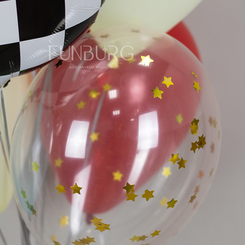 Набор мини-шариков для любителей автомобилей и гонок! В нём есть двухсторонний круг с ретро машинками, шар с шахматную клетку, конфетти-звёздочки и шарики в тон, идеально дополняющие главный шарик с рисунком.