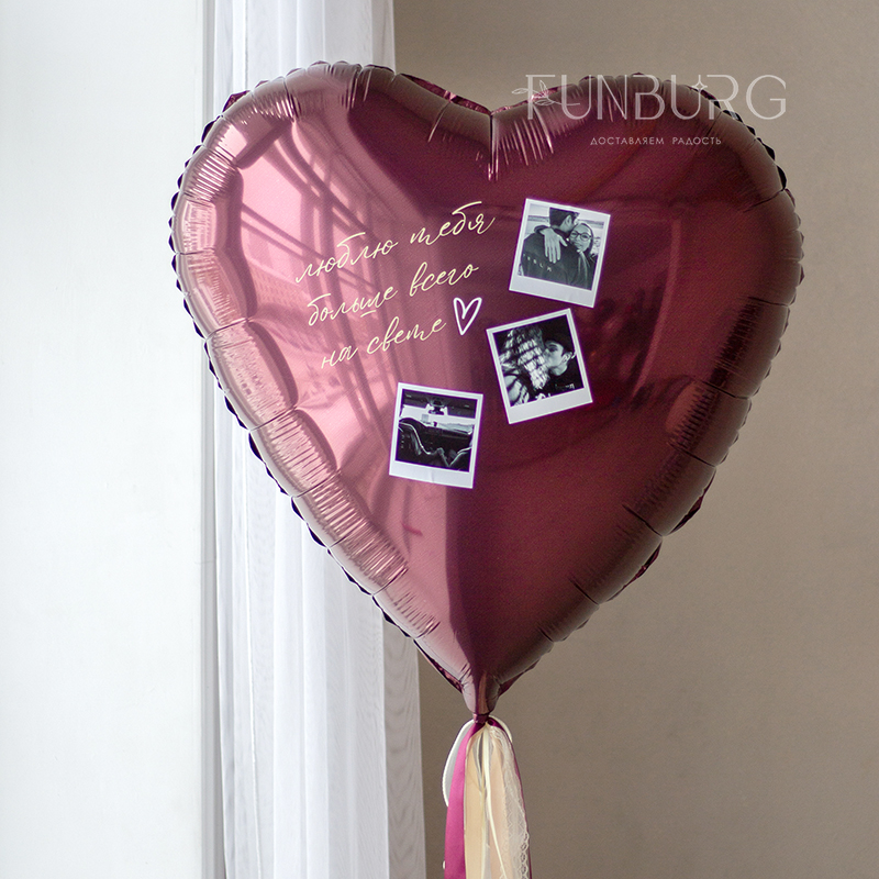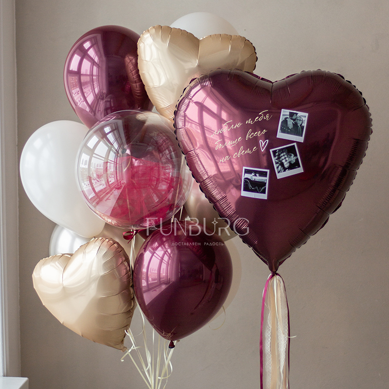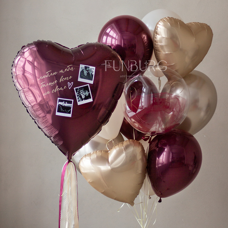 Большое сердце красивого насыщенного вишнёвого оттенка создано для того, чтобы сказать любимым о самых глубоких чувствах! Сердце мы декорировали уникальным украшением в виде ваших фотографий, придумали дизайн, а вам остается только выбрать из своего фотоархива самые ценные и подходящие снимки, придумать надпись (или использовать наш пример) - идеальный подарок любимым готов! Сердце мы дополнили идеально подходящей к нему связкой с шариками вишнёвых и кремово-золотистых оттенков, шаром bubble с фатином и мерцающими сердцами.