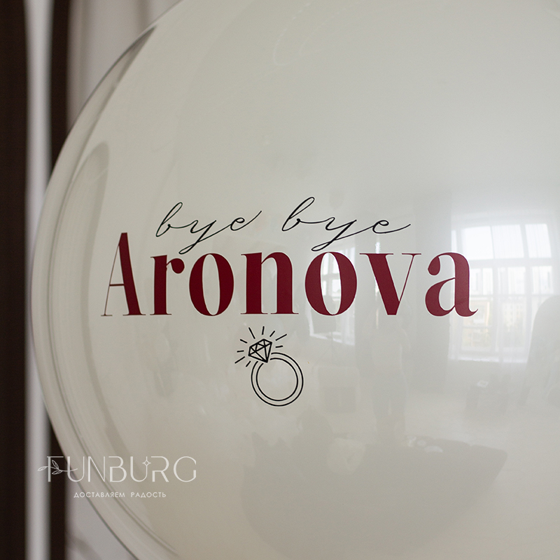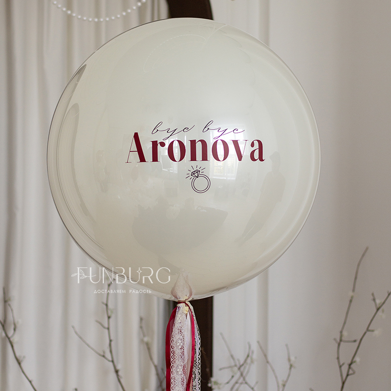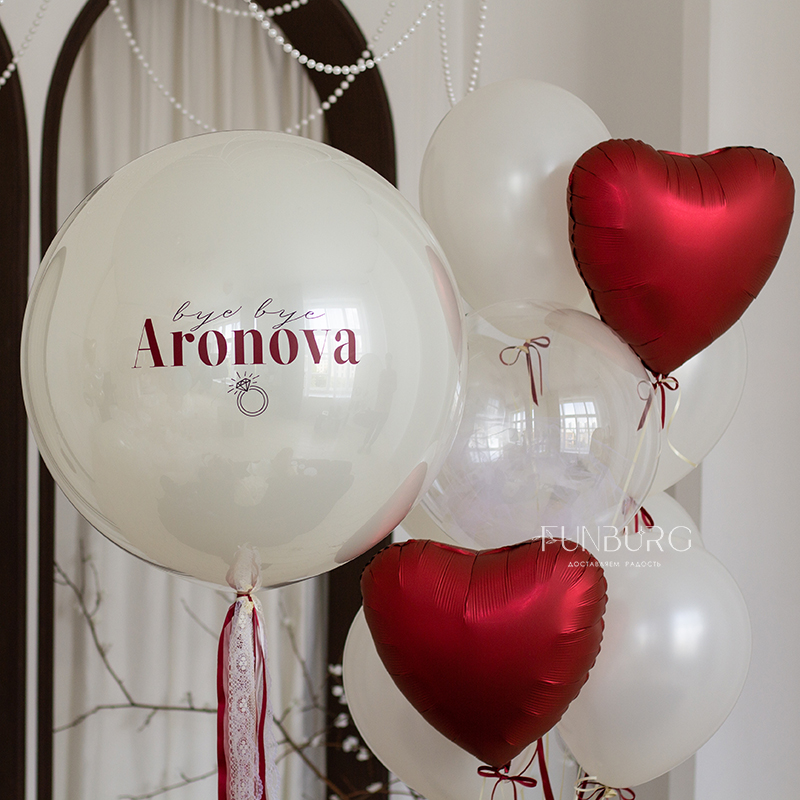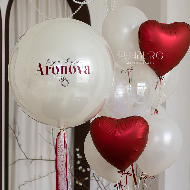 Большой зеркально-глянцевый шар нежнейшего мерцающего сливочно-белого оттенка с контрастной вишневой надписью идеально подойдет для девичника (фамилию на шаре можно изменить на любую) или для любого другого события, если полностью заменить надпись. Шар мы дополнили стильной связкой из шариков такого же оттенка, подвязанных бархатными вишневыми бантиками, шара Bubble с облачком фатина внутри и красных сатиновых сердечек.