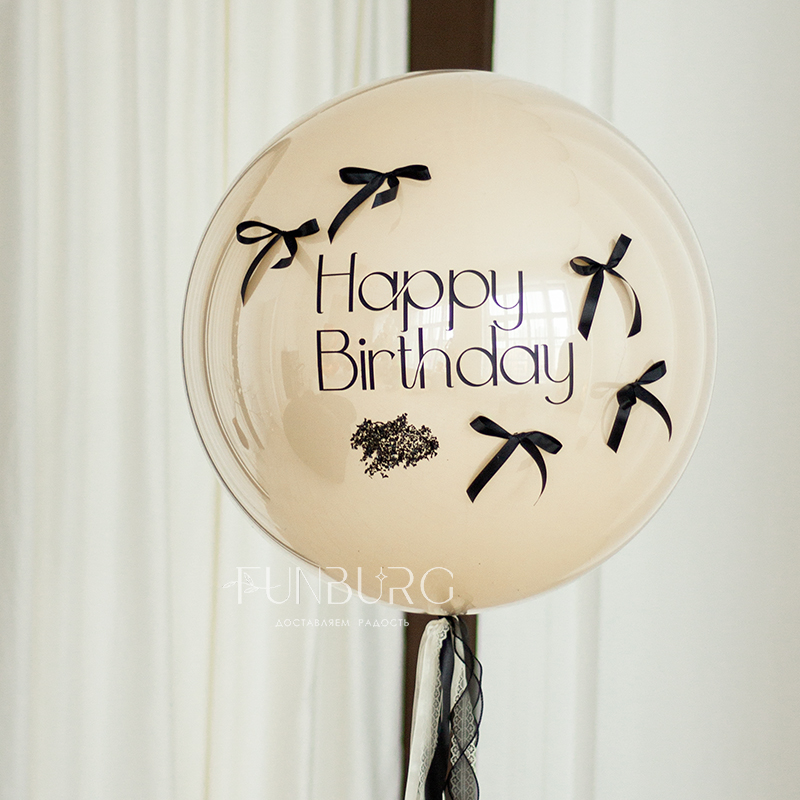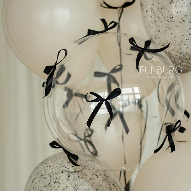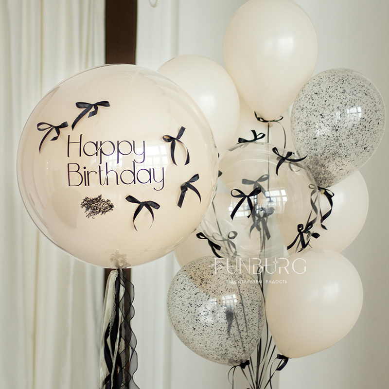 Большой зеркально-глянцевый кремовый шар с лаконичной надписью (ее можно сделать любой), дополненный шлейфом из лент, конфетти и бантиками. Шар мы дополнили идеально подходящей к нему связкой из кремовых шариков с бантиками, с шаром Bubble с бантиками и шариками с конфетти. Состав набора вы можете менять по вашему желанию.