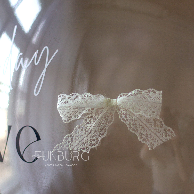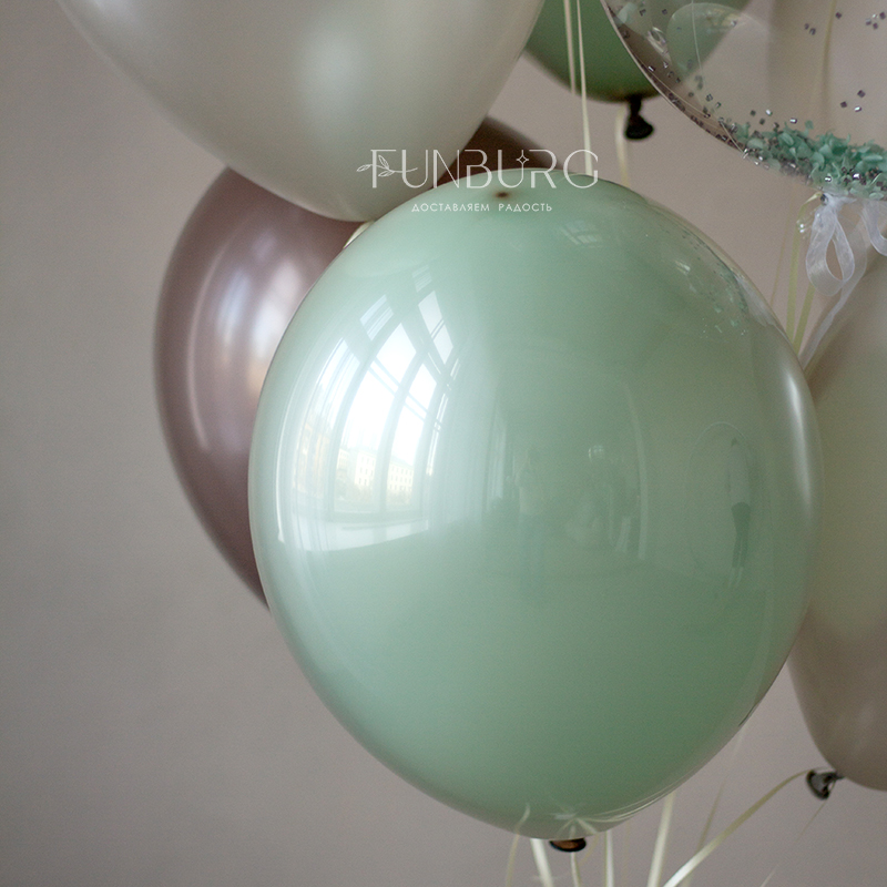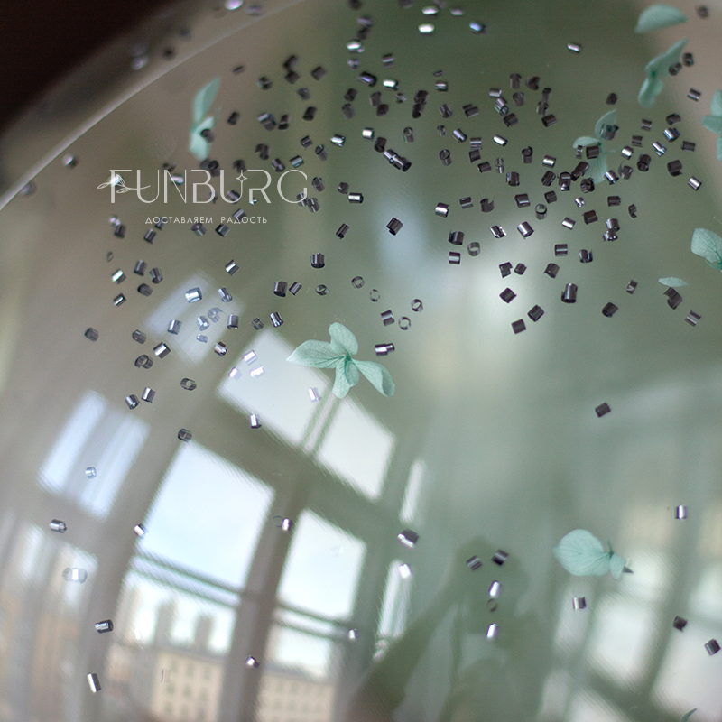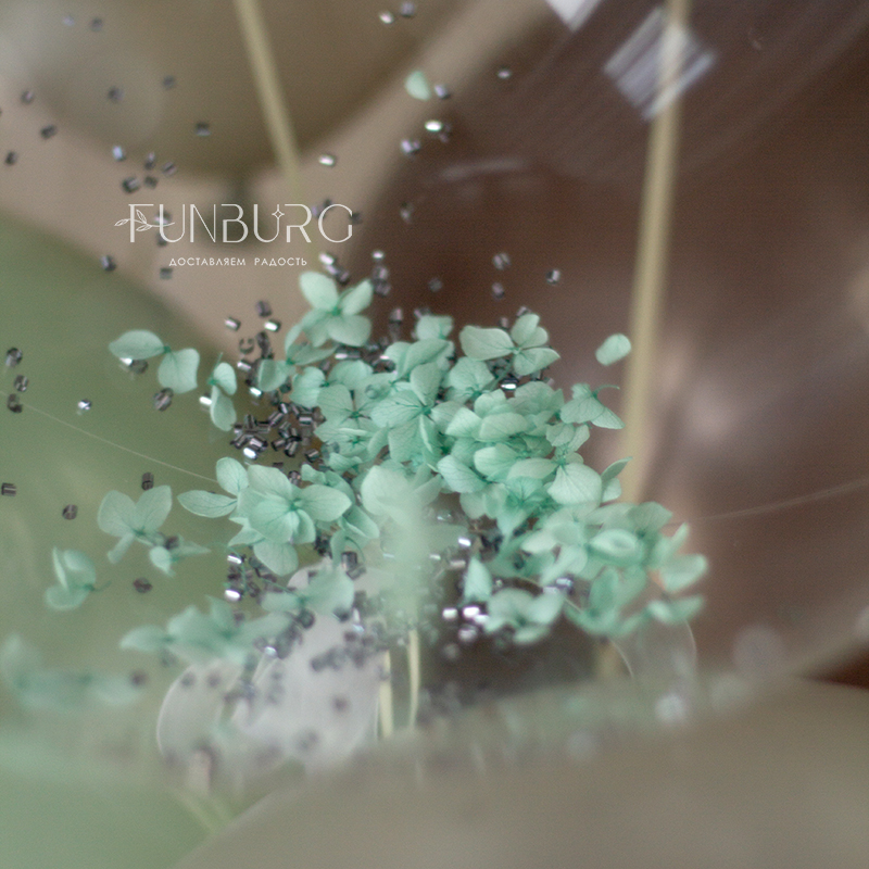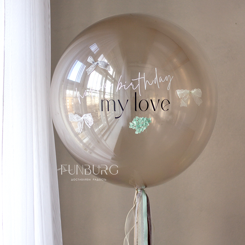 Большой глянцевый полупрозрачный шар сложного дымчатого оттенка с лаконичной надписью, декором из лепестков гортензии, кружевными бантиками, придающими немного винтажный вид, и шлейфом из ленточек станет стильным украшением праздника и идеальным подарком ценителям всего утонченного, необычного и изысканного. Шар мы дополнили идеально подходящей к нему связкой шариков с шаром Bubble с лепестками гортензии и конфетти, шариками дизайнерского дымчато-шалфейного оттенка, шоколадными и мерцающими кремовыми шарами.