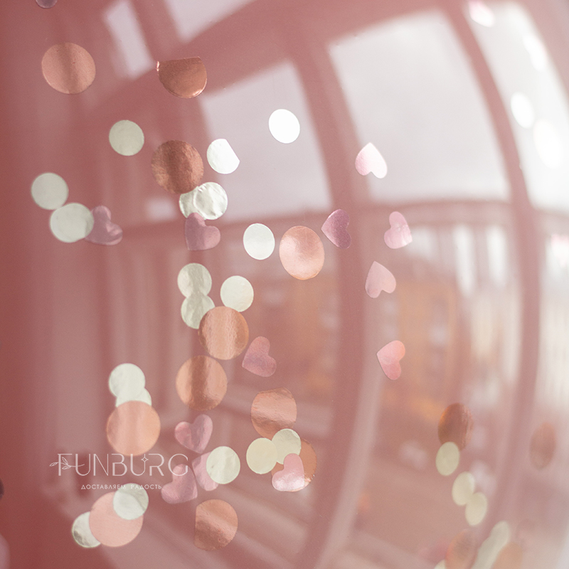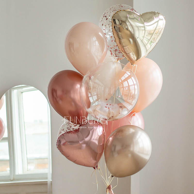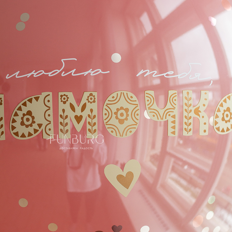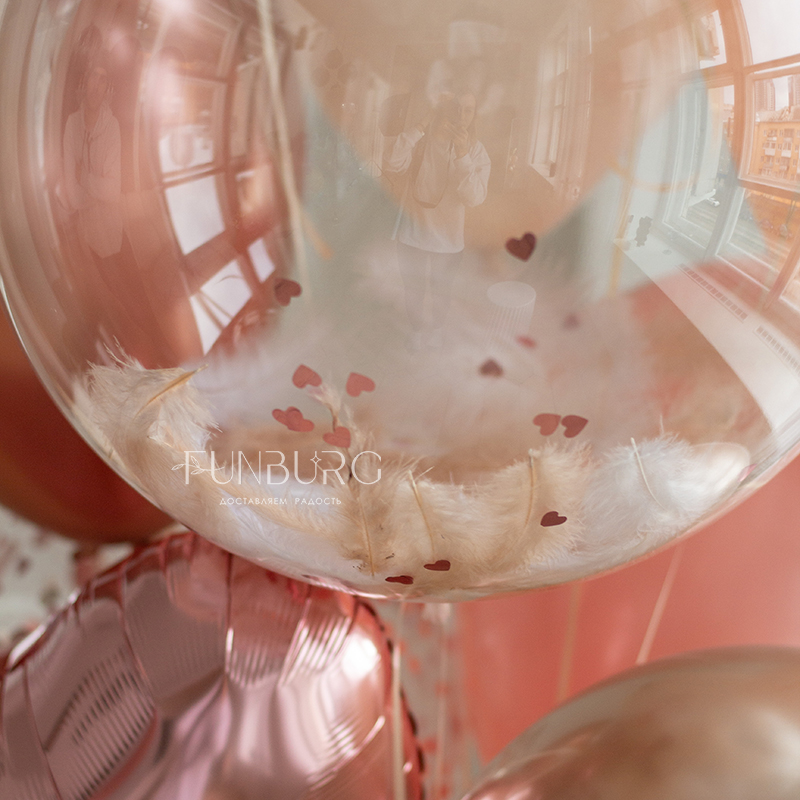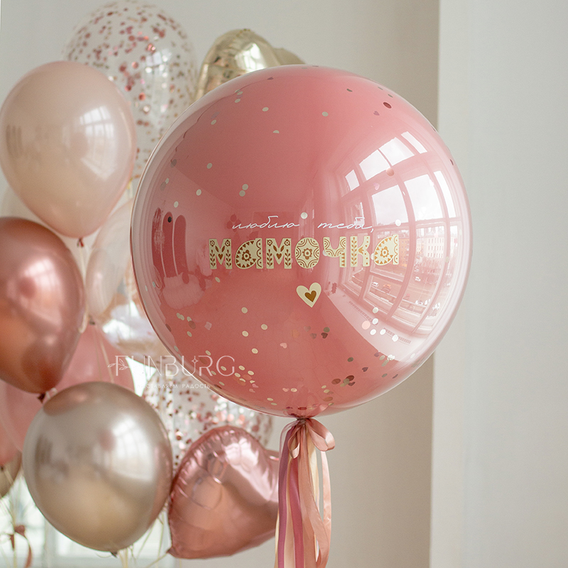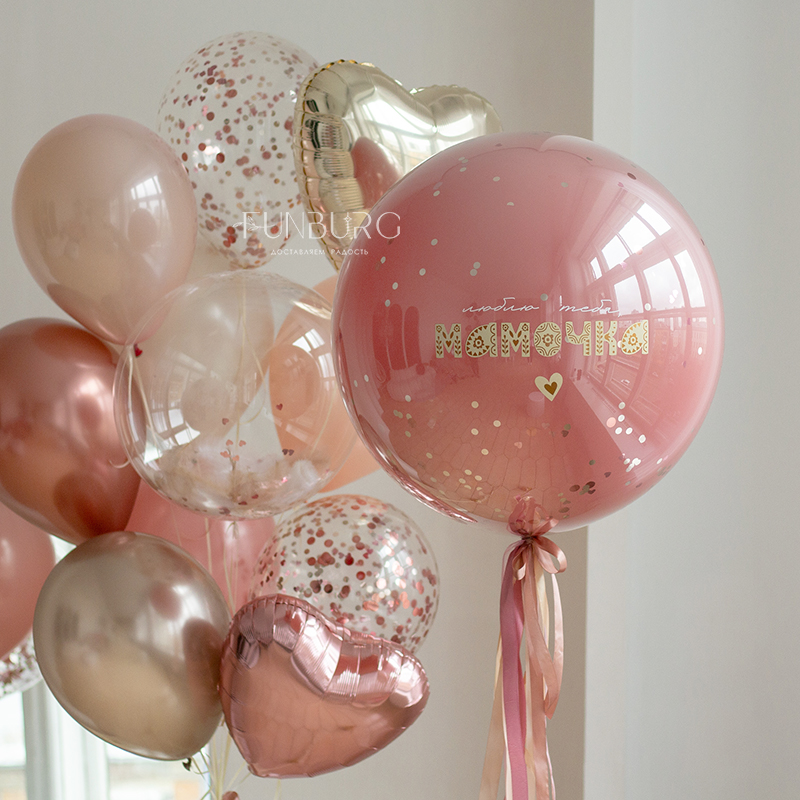 Большой зеркально-глянцевый шар мягкого, нежного и очень уютного пудрового оттенка с бронзово-кремовой надписью красивым узорным шрифтом для самого любимого и дорогого человека на свете. Сочетание этих оттенков напоминает теплый миндальный пирог, который ждет, пока все самые близкие соберутся за большим столом, с согревающим чаем и разговорами. Шар дополняет идеально подходящая к нему связка шариков с шаром Bubble с перьями, шариками-сердечками, с конфетти.