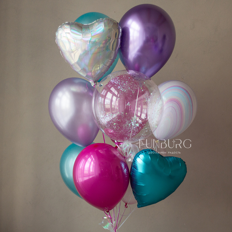 Большой глянцевый шар насыщенного ярко-розового полупрозрачного, как леденец, оттенка, с лаконичной надписью и оформлением сверкающим конфетти и шлейфом из ленточек. Идеально для поздравления тех, кто любит яркое и эффектное! Шар мы дополнили не менее эффектной, идеально дополняющей его связкой бирюзово-розовых и пурпурных оттенков, со сверкающими конфетти и переливающимся сердцем.