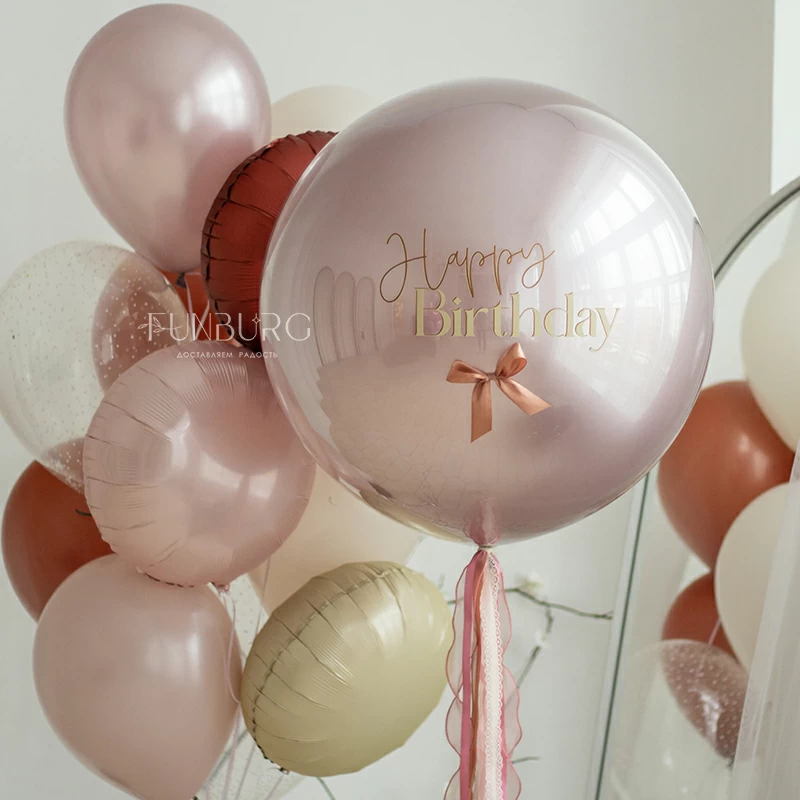Большой зеркально-глянцевый мерцающий шар завораживающего сложного пыльно-розового оттенка коллекции Silk с поздравлением, украшением из бантика и шлейфа из розово-бежевых лент идеально подойдет для эффектного и очень красивого поздравления самых близких и украшения самого стильного праздника. Мы дополнили шар идеально подходящей к нему связкой в пыльно-розовых и терракотовых оттенках - для любителей стильных, необычных, нежных и мягких сочетаний подойдет идеально!