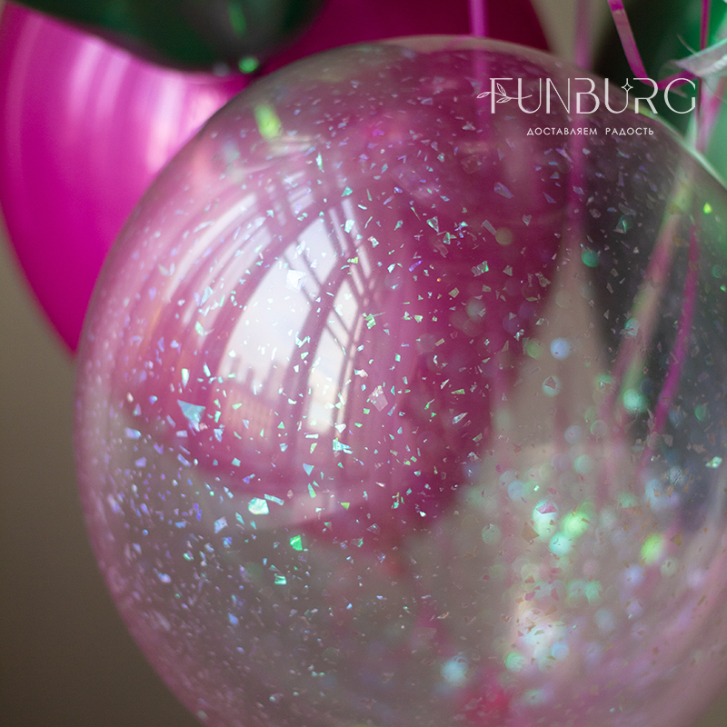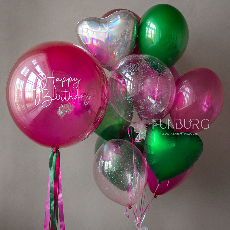 Большой глянцевый шар насыщенного ярко-розового полупрозрачного, как леденец, оттенка, с лаконичной надписью и оформлением сверкающим конфетти и шлейфом из ленточек. Идеально для поздравления тех, кто любит яркое и эффектное! Шар мы дополнили не менее эффектной, идеально дополняющей его связкой изумрудно-розовых и пурпурных оттенков, со сверкающими конфетти и переливающимся сердцем.