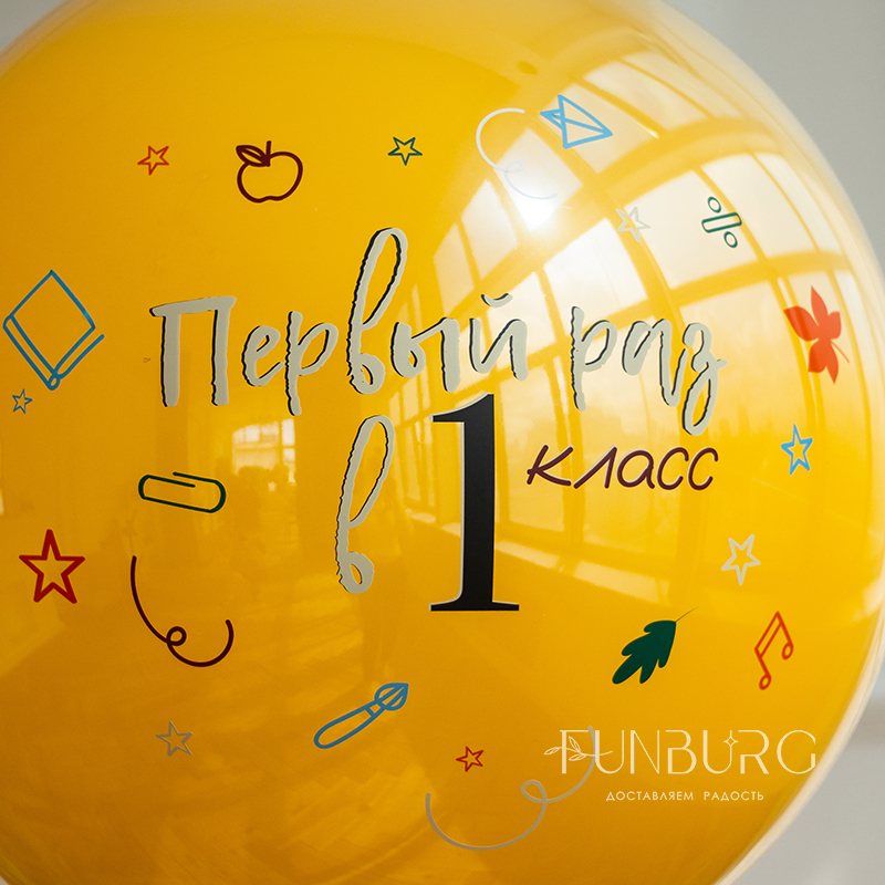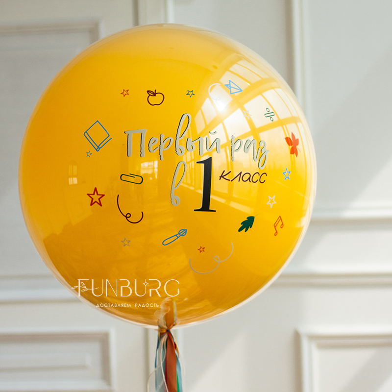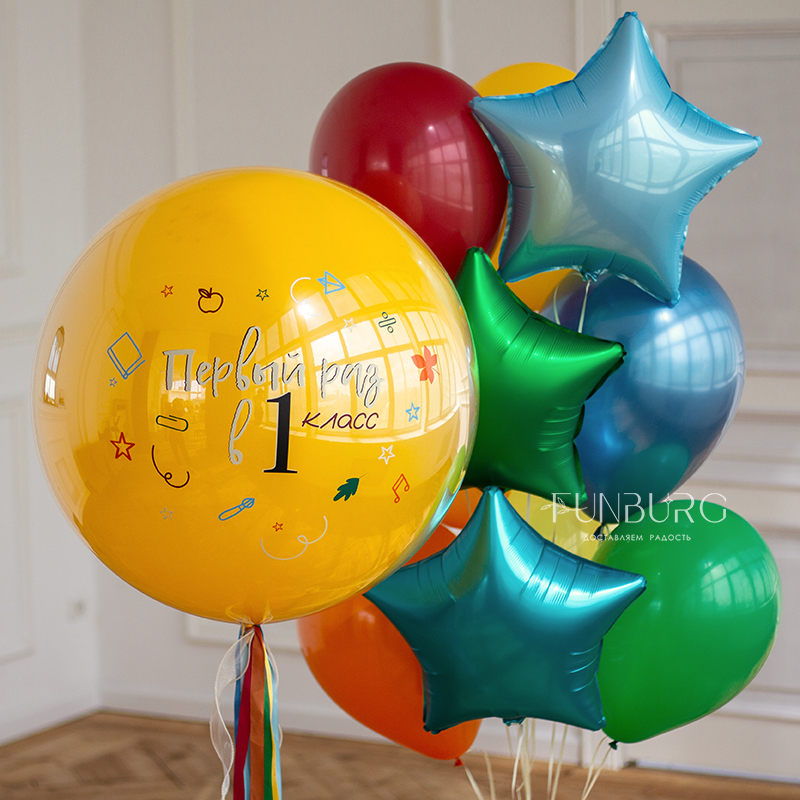 Большой медово-желтый зеркально-глянцевый шар с лентами, тематической надписью (надпись может быть любой) и наклейками идеален для того, чтобы сделать первый день школы запоминающимся и совсем не грустным! А если изменить надпись, то шар отлично подойдет для множества других важных событий. Шар мы дополнили идеально подходящей к нему связкой разноцветных шариков со звездами.