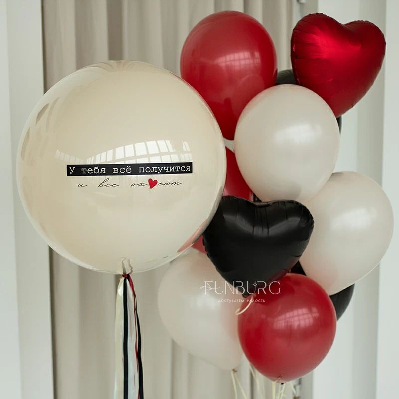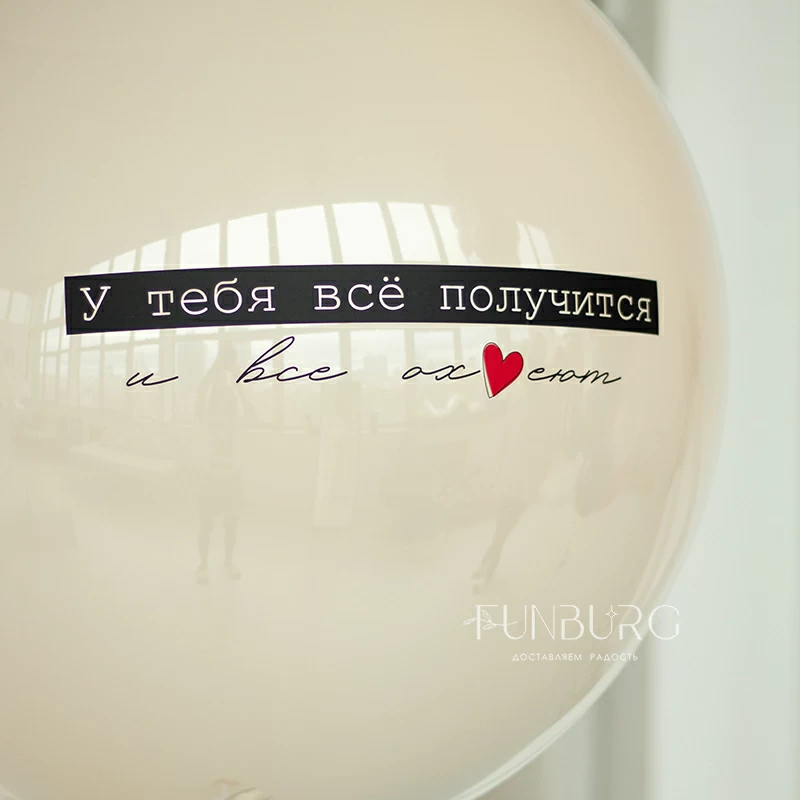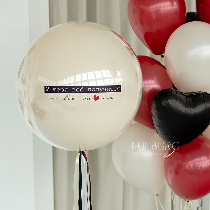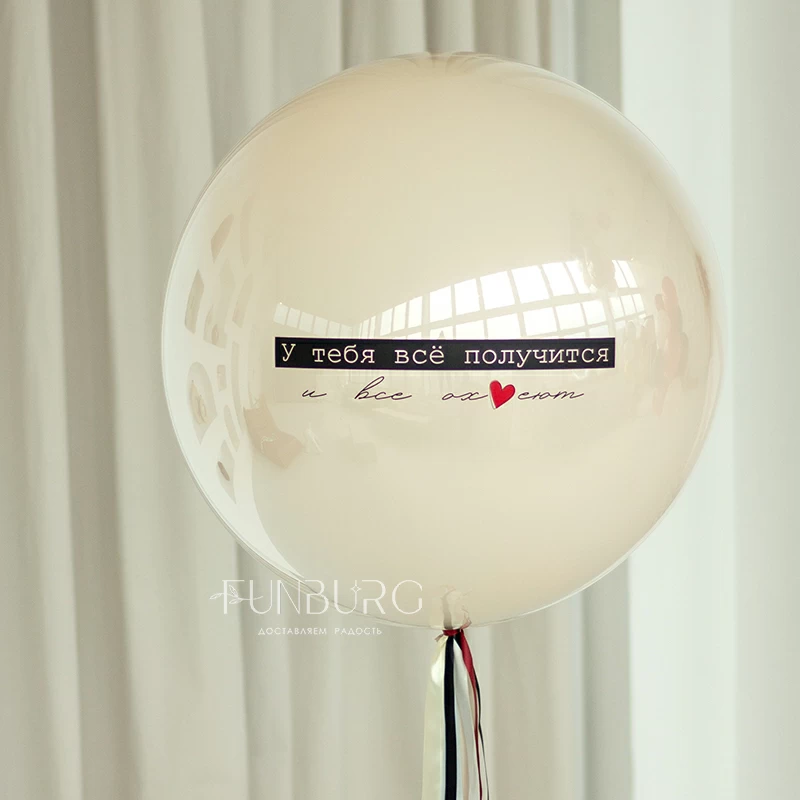 Большой зеркально-глянцевый кремовый шар с лентами и надписью, которая идеально подойдет, когда хочется поддержать близкого и придать ему веры в себя и свои силы! Шар мы дополнили контрастной связкой шариков, идеально дополняющей его цветовую гамму.