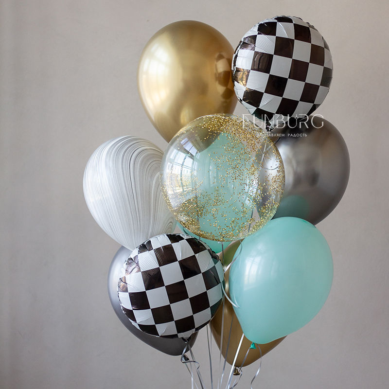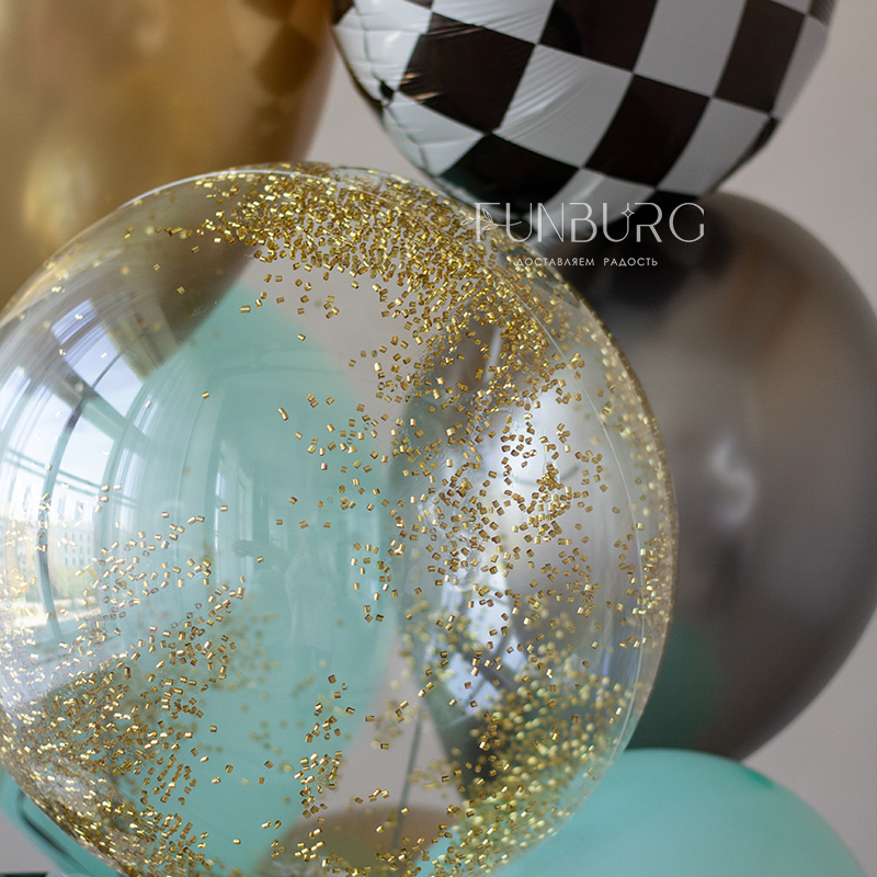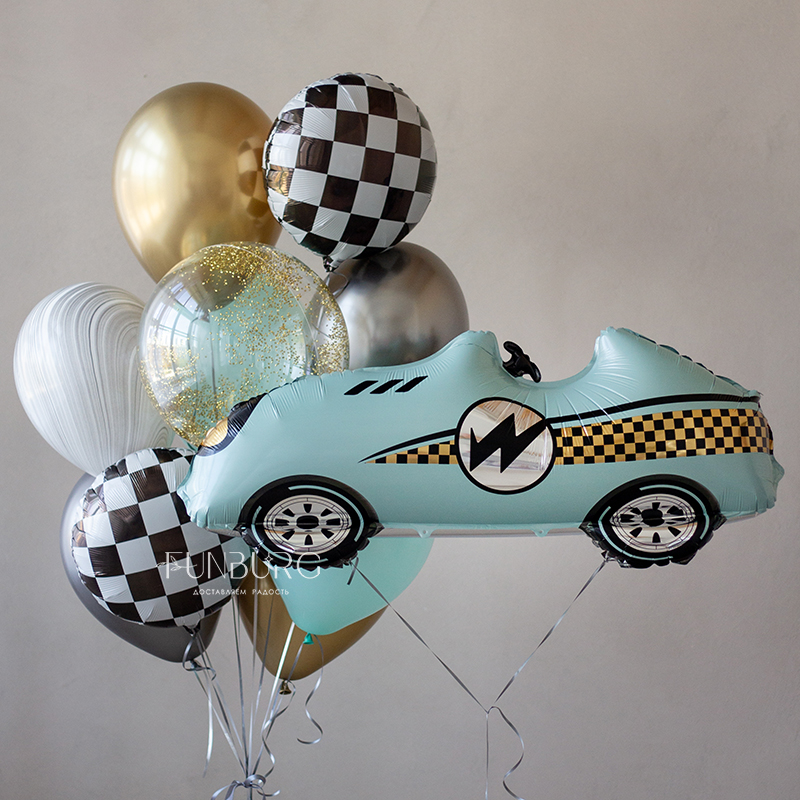 Большая объемная гоночная машинка и стильная связка шариков золотых, стальных, мятно-голубых оттенков с шаром Bubble с золотистым конфетти-цилиндрами и акцентными кругами в шахматную клетку. Этот набор идеально подойдет для оформления вечеринки в стилистике Формулы 1 и просто для любителя машин.