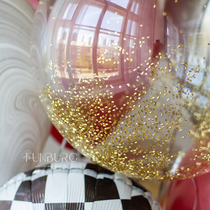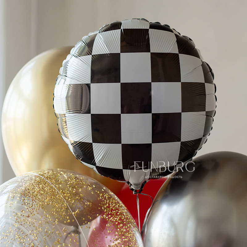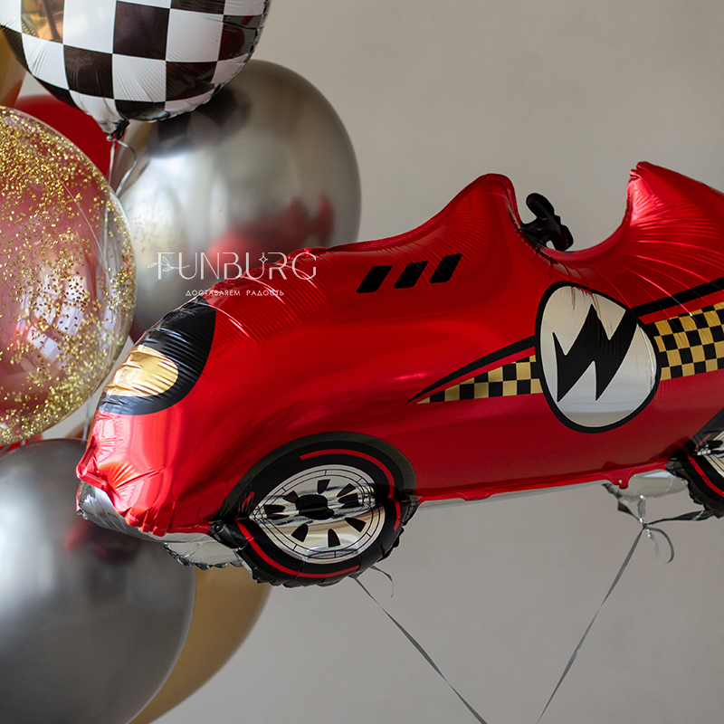 Сверкающая красная объёмная гоночная машинка и стильная связка шариков золотых, стальных, насыщенно-красных оттенков с шаром Bubble с золотистым конфетти-цилиндрами и акцентными кругами в шахматную клетку. Этот набор идеально подойдет для оформления вечеринки в стилистике Формулы 1 и просто для любителя машин.