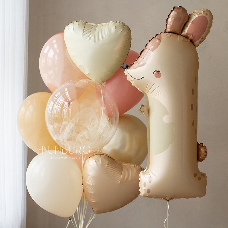 Готовый стильный набор для украшения праздника или подарка на день рождения! Красивая сатиновая цифра 1 в форме милого зайки и нежная связка шариков под цвет, с шаром Bubble с облачком фатина и сердечками.