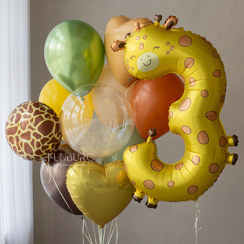 Готовый стильный набор для украшения праздника или подарка на день рождения! Красивая яркая цифра 3 в форме забавного жирафика и тематическая связка шариков под цвет, с шаром Bubble с фатином, кругом с принтом в виде окраски жирафа и сердечками.