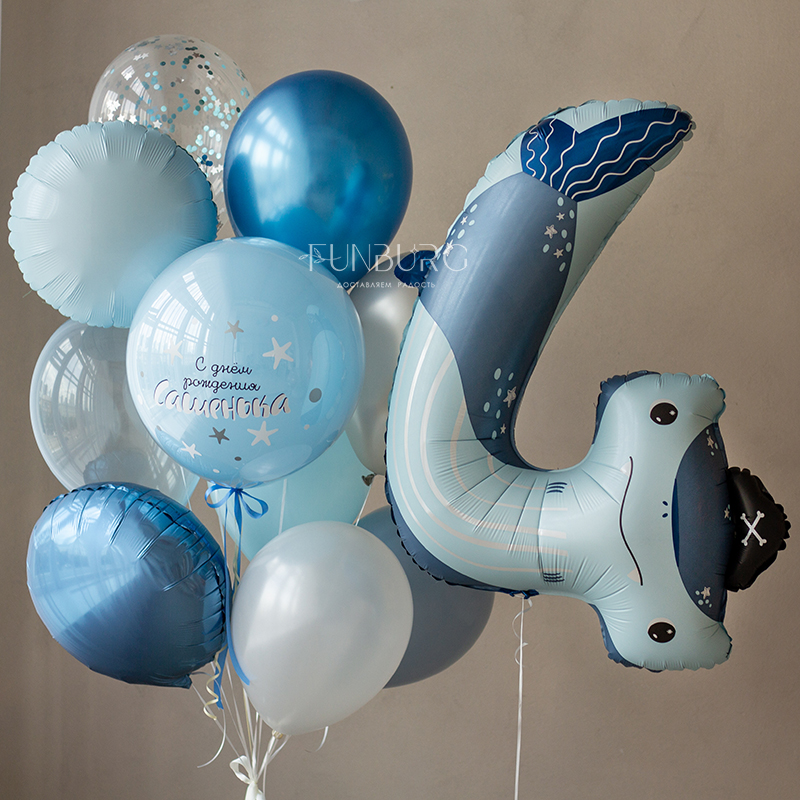 Готовый стильный набор для украшения праздника или подарка на день рождения! Красивая сатиновая цифра 4 в форме забавной акулы и тематическая связка шариков под цвет, с стеклянным шаром с поздравлением (надпись можно сделать любой), кругами из фольги и шариками с конфетти.