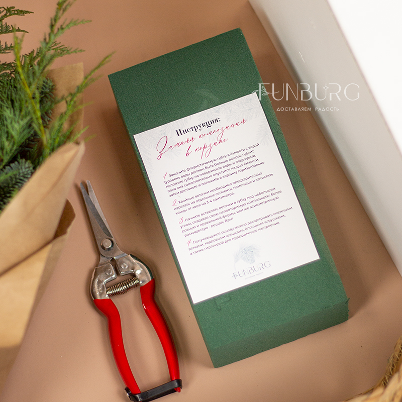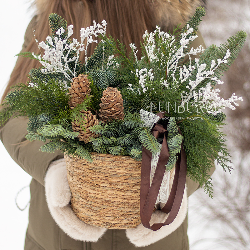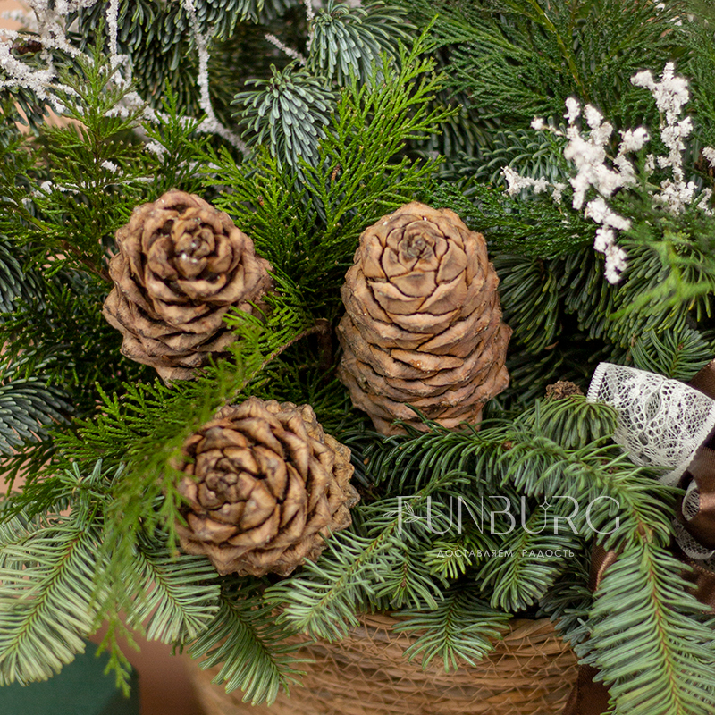 Почувствуйте себя настоящим флористом или помощником Санты, создавая свою неповторимую ароматную зимнюю корзину из еловых веточек, шишек и заснеженных веток! В нашей фирменной коробке есть для этого всё необходимое: ветки нобилиса, туи, заснеженный лимониум и колоритные кедровые шишки, уютная плетёная корзинка, флористическая губка, секатор, чтобы обрезать толстые стебли, памятка-инструкция по сборке и уходу за композицией. Следуйте простой инструкции, создавайте свою уникальную композицию и наслаждайтесь новогодним настроением! Вы можете дополнить композицию елочными игрушками, светодиодной гирляндой и другим декором - наш набор будет идеальным холстом для вашего творчества!