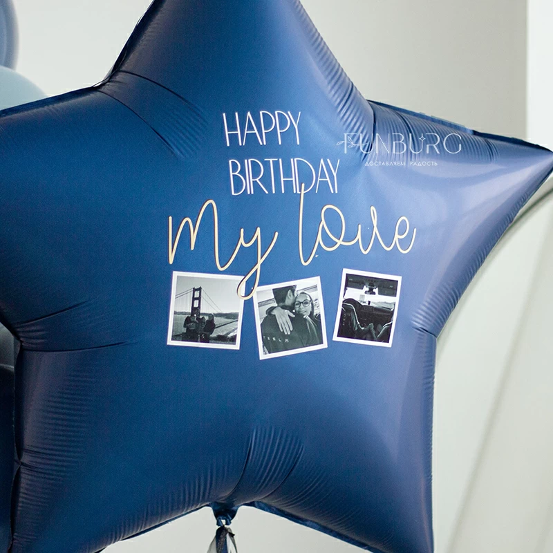 Огромная сатиновая звезда красивого темно-синего оттенка с уникальным украшением в виде ваших фотографий и надписи (ее можно сделать любой) станет незабываемым и очень трогательным подарком близким! Мы придумали дизайн расположения фотографий и надписи, а вам остается только выбрать из своего фотоархива самые ценные и подходящие снимки, отправить их нам на почту, придумать надпись (или использовать наш пример) - идеальный сюрприз для близкого человека готов! Эффектную звезду мы дополнили идеально подходящей необычной связкой шариков.