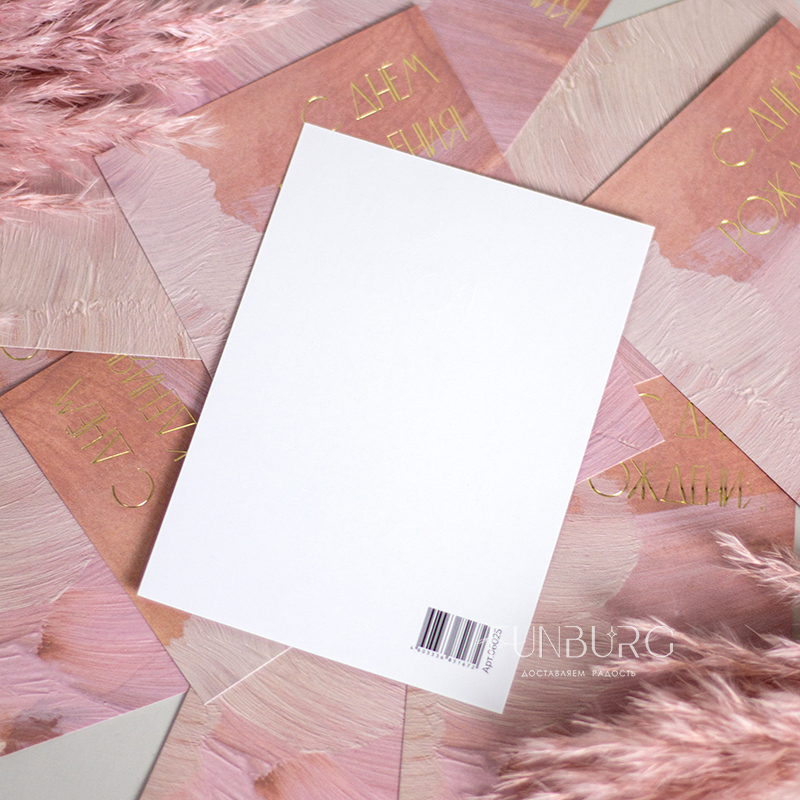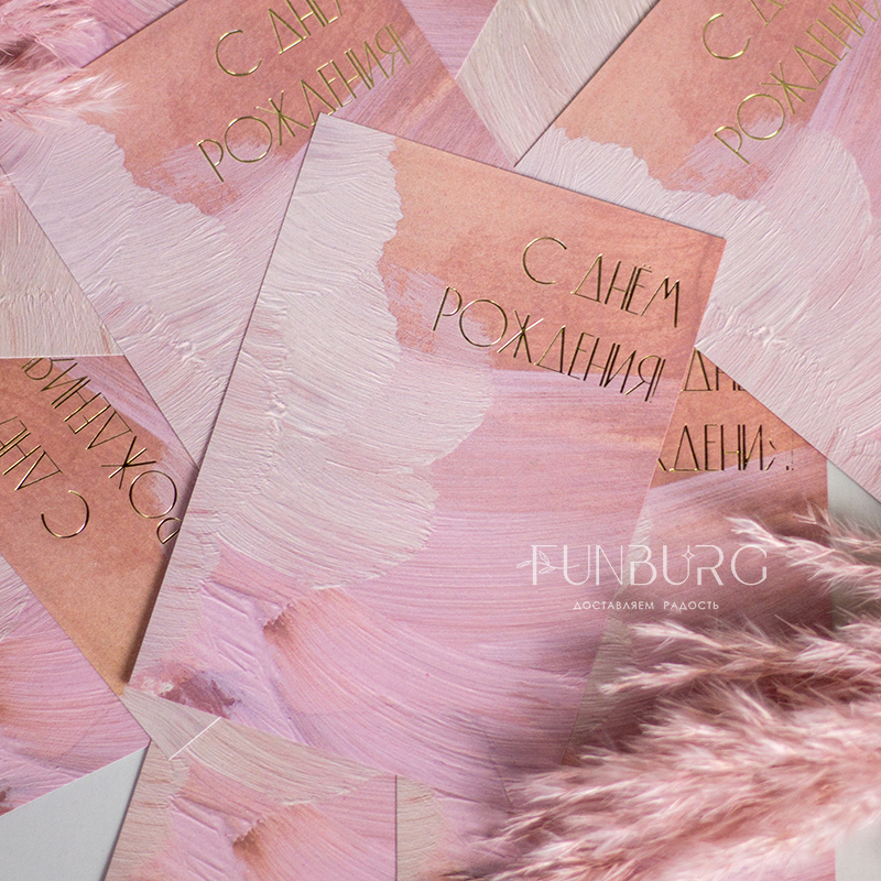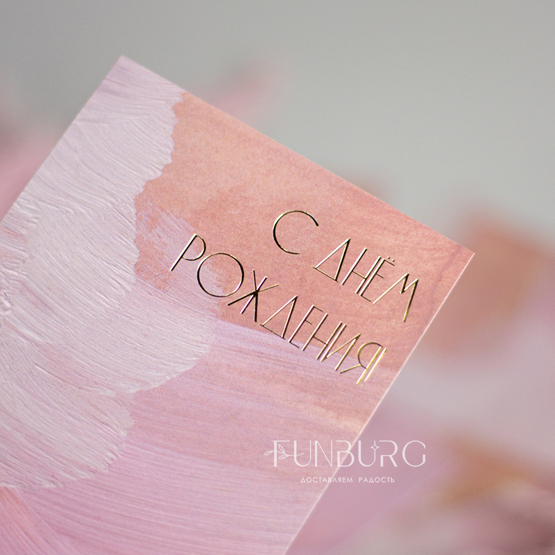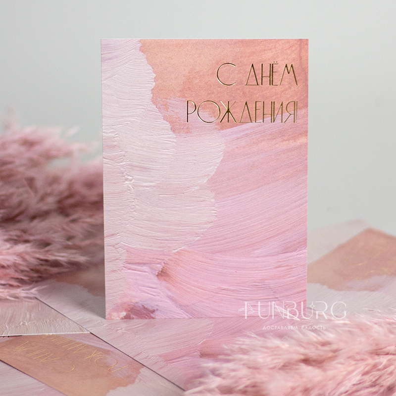 Красивая нежная открытка-карточка с лаконичным принтом, похожим на мазки густой розово-персиковой краски, и золотистым поздравлением с днём рождения. На обратной стороне открытки нет заранее написанных пожеланий, чтобы вы могли сами добавить несколько важных строк, которые будут гораздо ценнее любого даже самого красивого готового текста-поздравления.