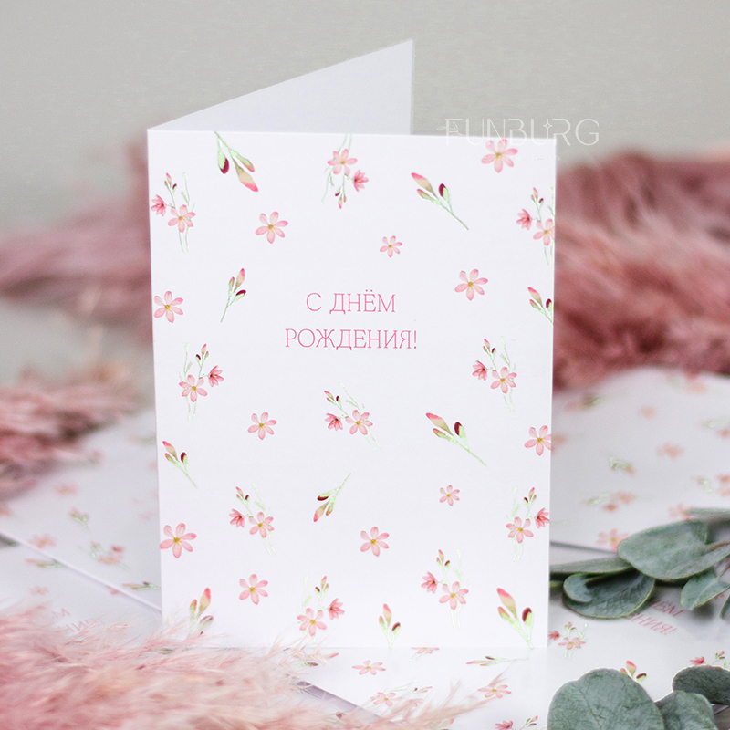 Красивая открытка с нежным принтом в виде акварельных миниатюрных цветочкой. Внутри открытки нет заранее написанных пожеланий, чтобы вы могли сами добавить несколько важных строк, которые будут гораздо ценнее любого даже самого красивого готового текста-поздравления.