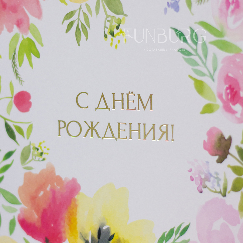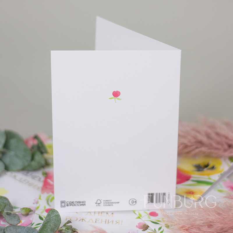 Красивая открытка с нежным принтом в виде акварельных ярких цветочков. Внутри открытки нет заранее написанных пожеланий, чтобы вы могли сами добавить несколько важных строк, которые будут гораздо ценнее любого даже самого красивого готового текста-поздравления.