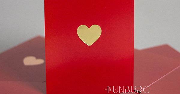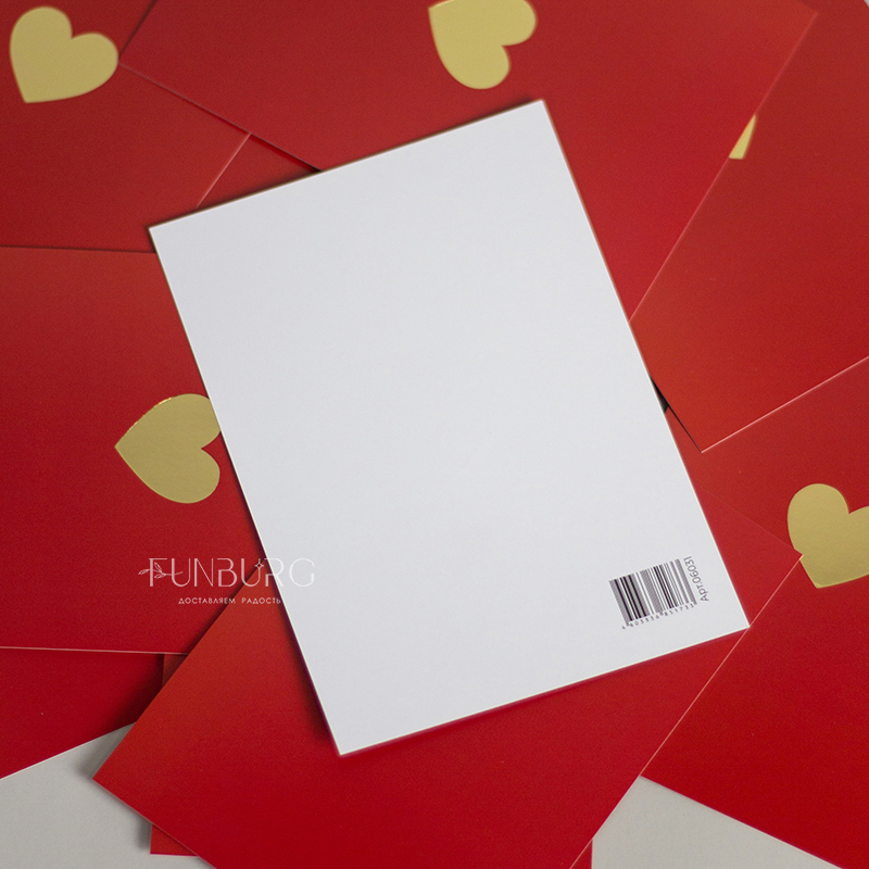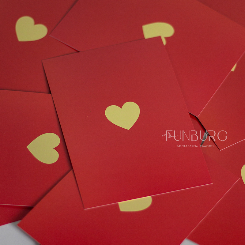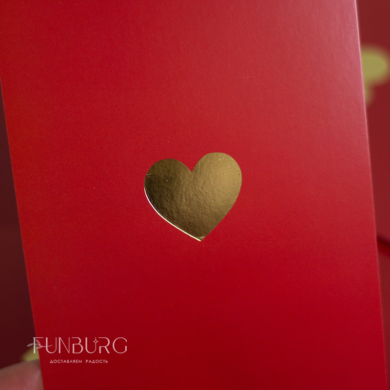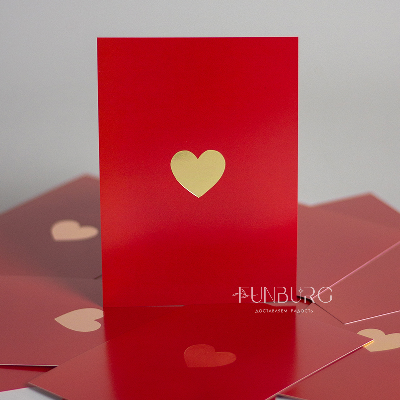 Минималистичная открытка-карточка красивого насыщенного красного цвета с золотистым сердечком для самых красивых признаний. На обратной стороне открытки нет заранее написанных пожеланий, чтобы вы могли сами добавить несколько важных строк, которые будут гораздо ценнее любого даже самого красивого готового текста-поздравления.
