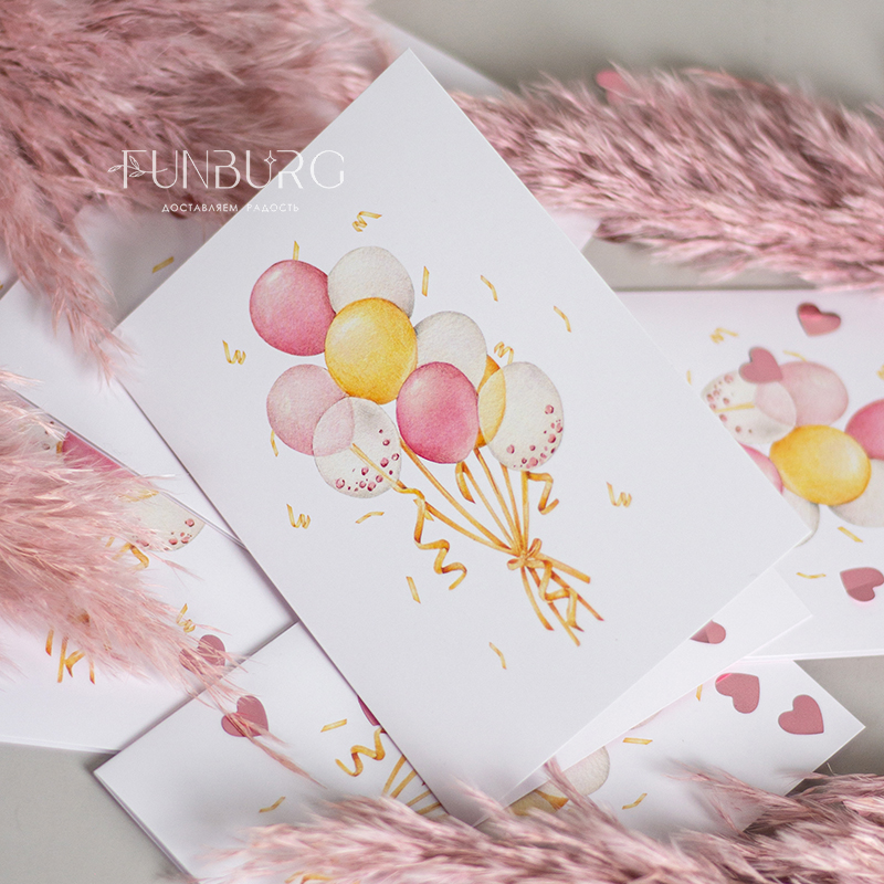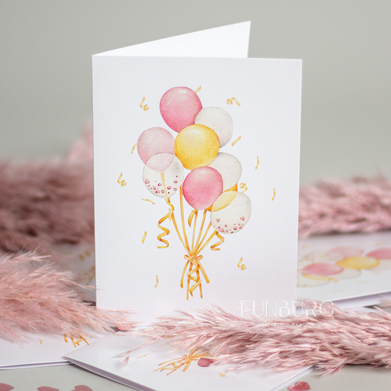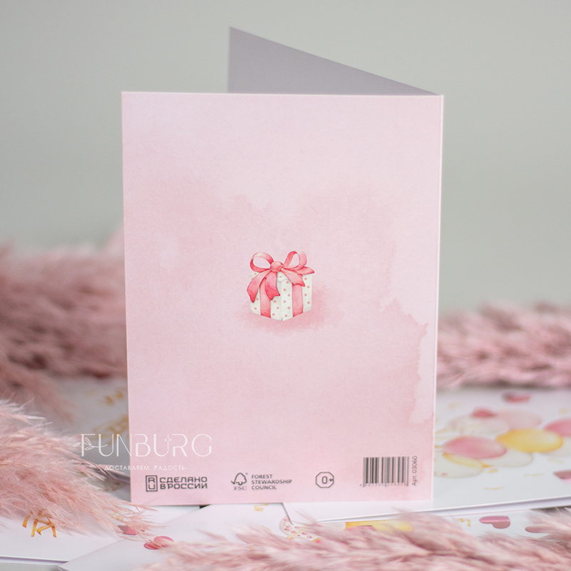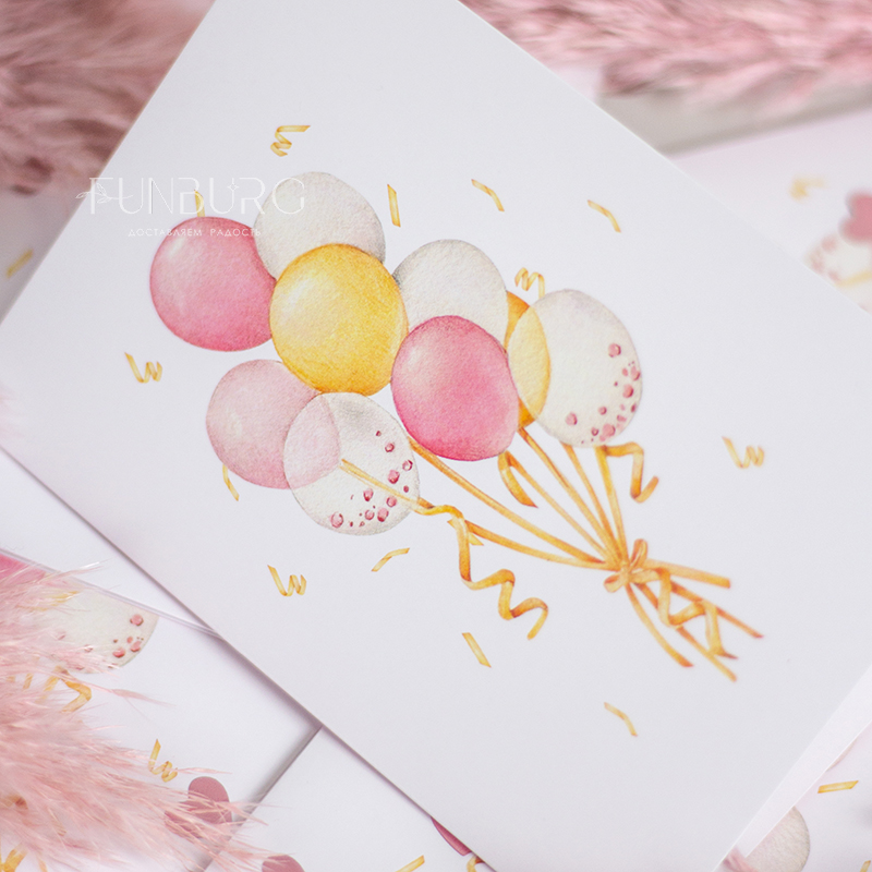 Красивая открытка с нежным принтом в виде акварельных воздушных шариков. Внутри открытки нет заранее написанных пожеланий, чтобы вы могли сами добавить несколько важных строк, которые будут гораздо ценнее любого даже самого красивого готового текста-поздравления.