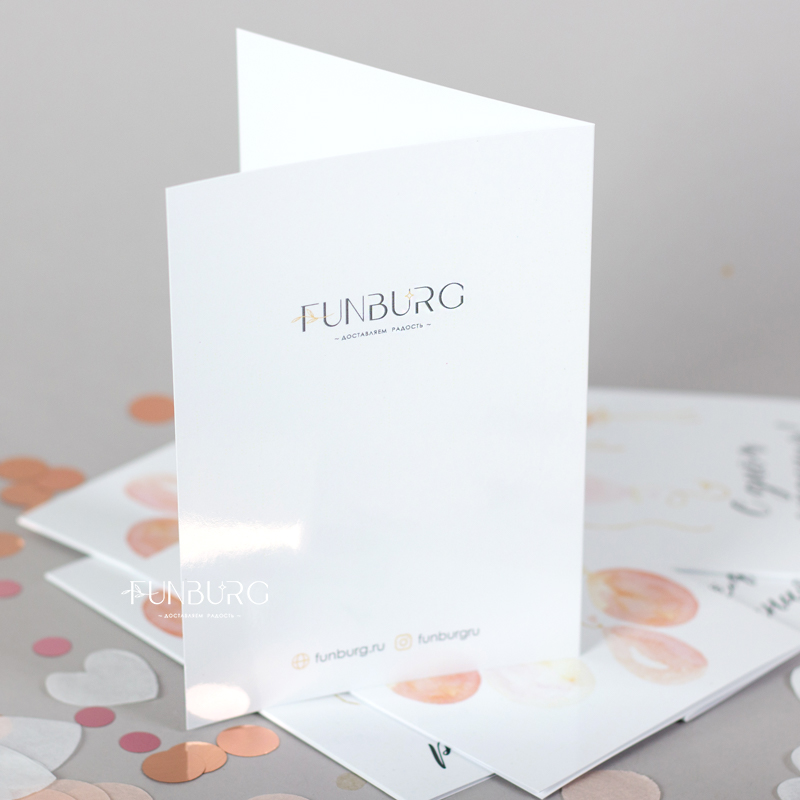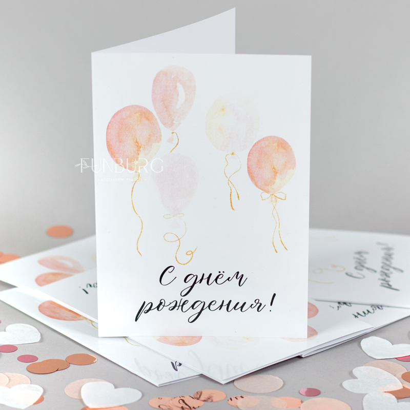 Красивая открытка с нежным принтом в виде акварельных воздушных шариков. Внутри открытки нет заранее написанных пожеланий, чтобы вы могли сами добавить несколько важных строк, которые будут гораздо ценнее любого даже самого красивого готового текста-поздравления.