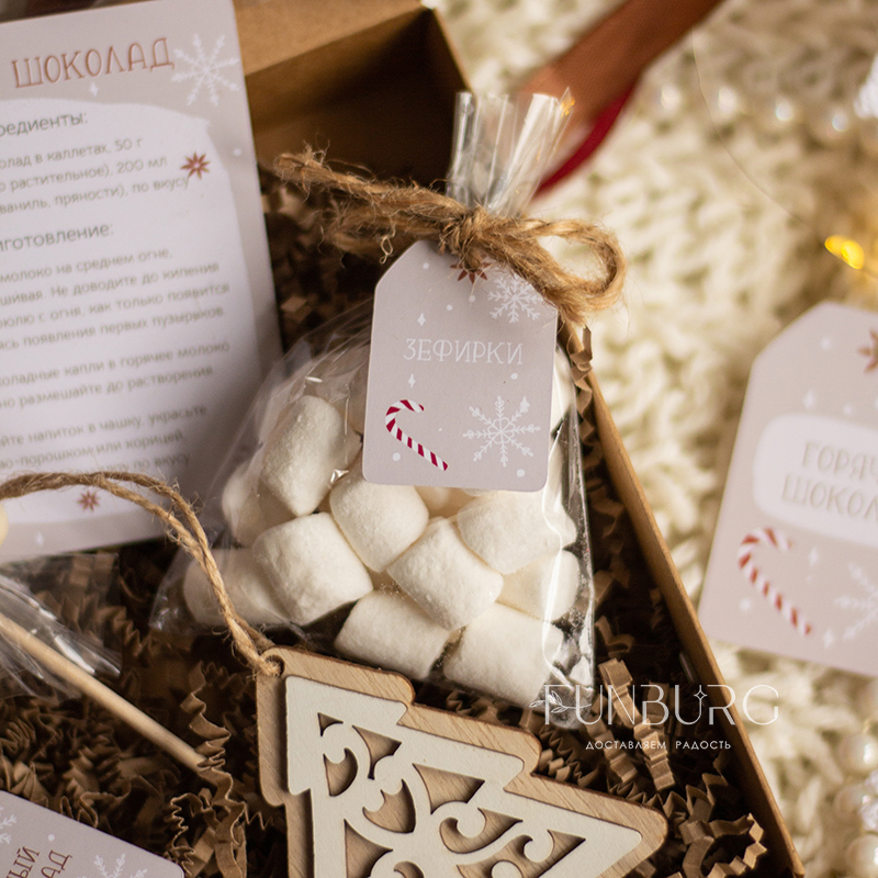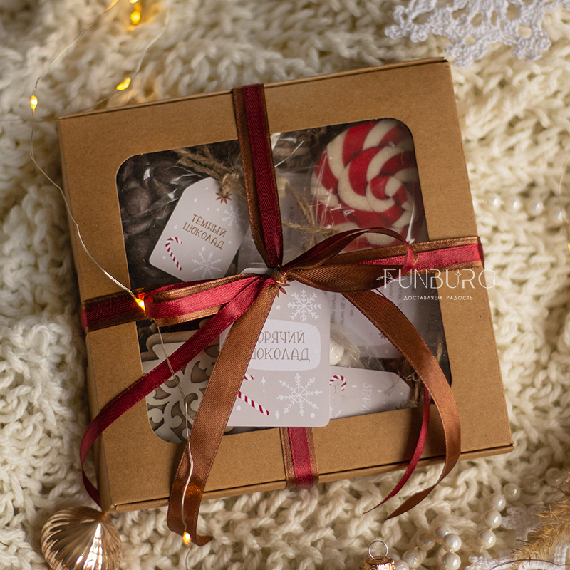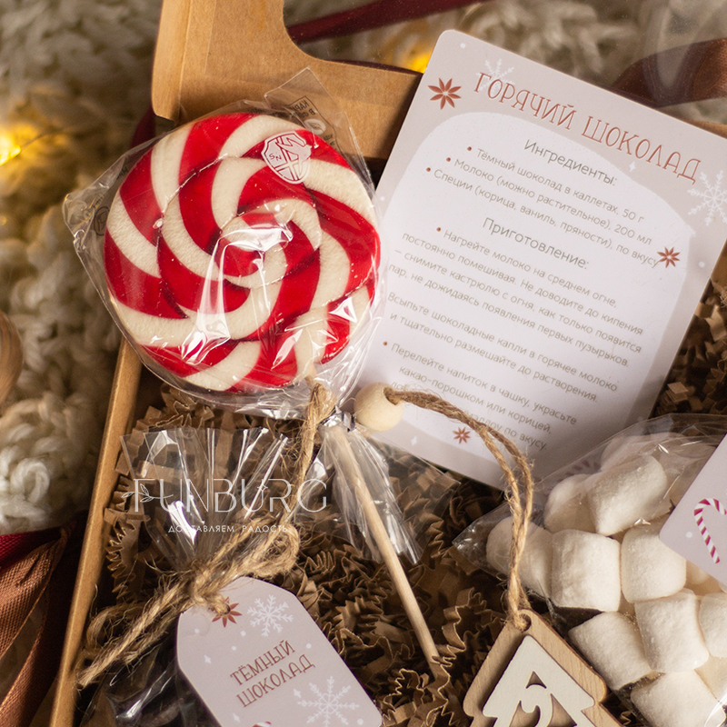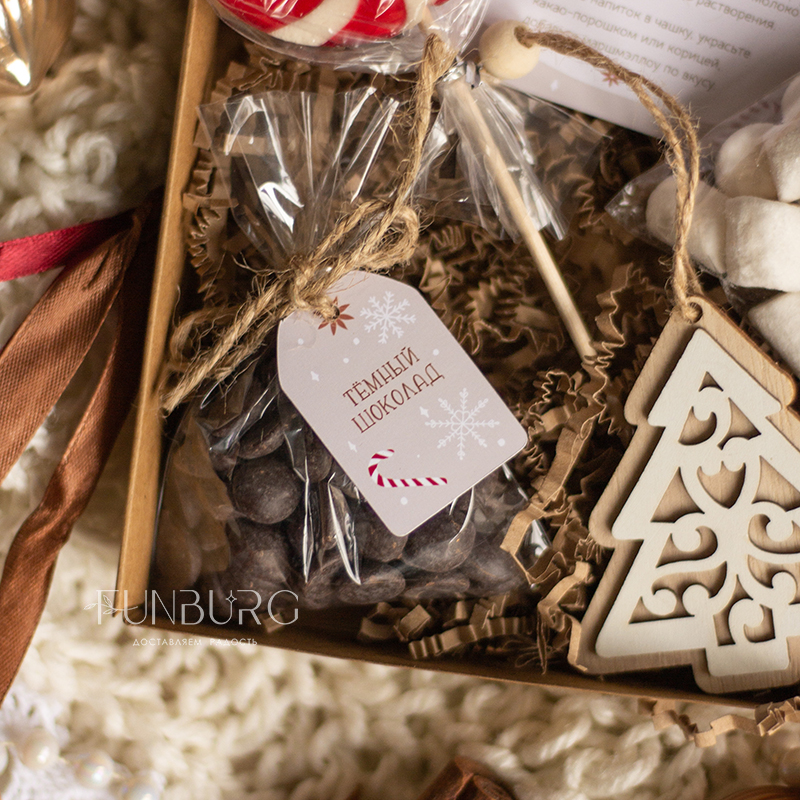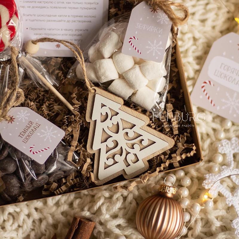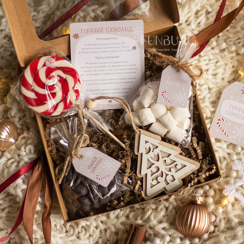 В этой небольшой коробочке есть всё для приготовления настоящего горячего шоколада! В ней: бельгийский шоколад в каплях (молочный или горький), зефирки, праздничный леденец, рецепт горячего шоколада и ёлочная деревянная игрушка. Все, что нужно сделать: добавить шоколадные капли в подогретое молоко по рецепту, хорошо размешать и добавить зефирки! Идеально для зимних сюрпризов по поводу и без!