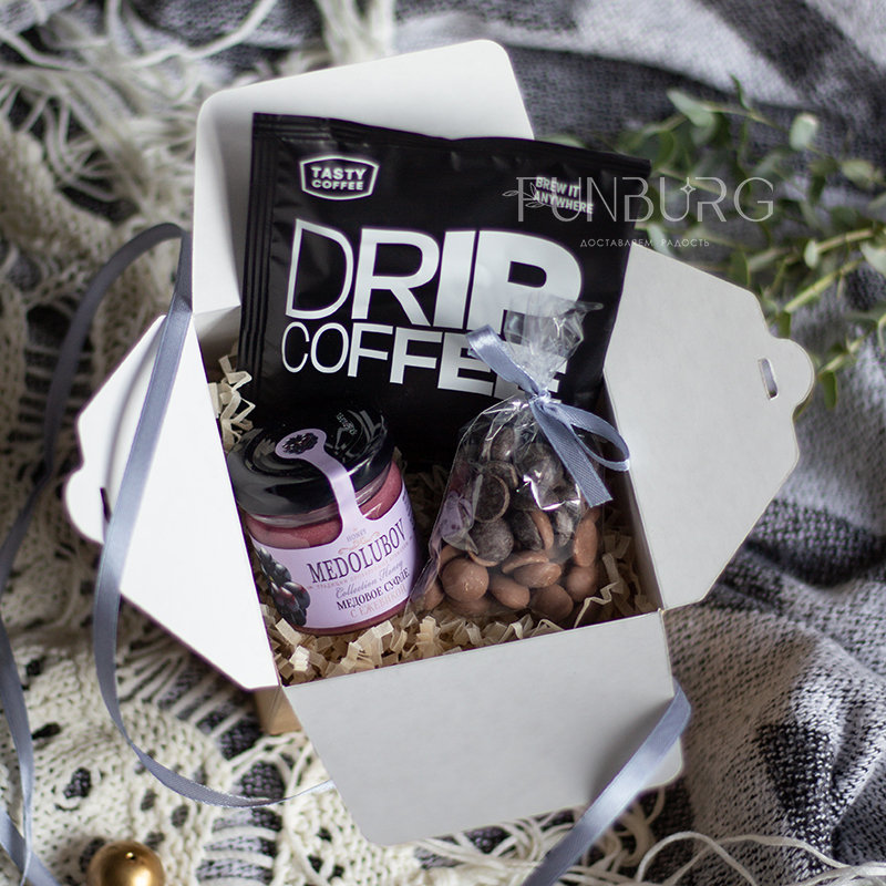 Небольшой набор для сладкого кофе-брейка: в нем пакетик ароматного кофе в удобном дрип-пакете, нежный крем-мёд и капли бельгийского шоколада (молочного и горького).