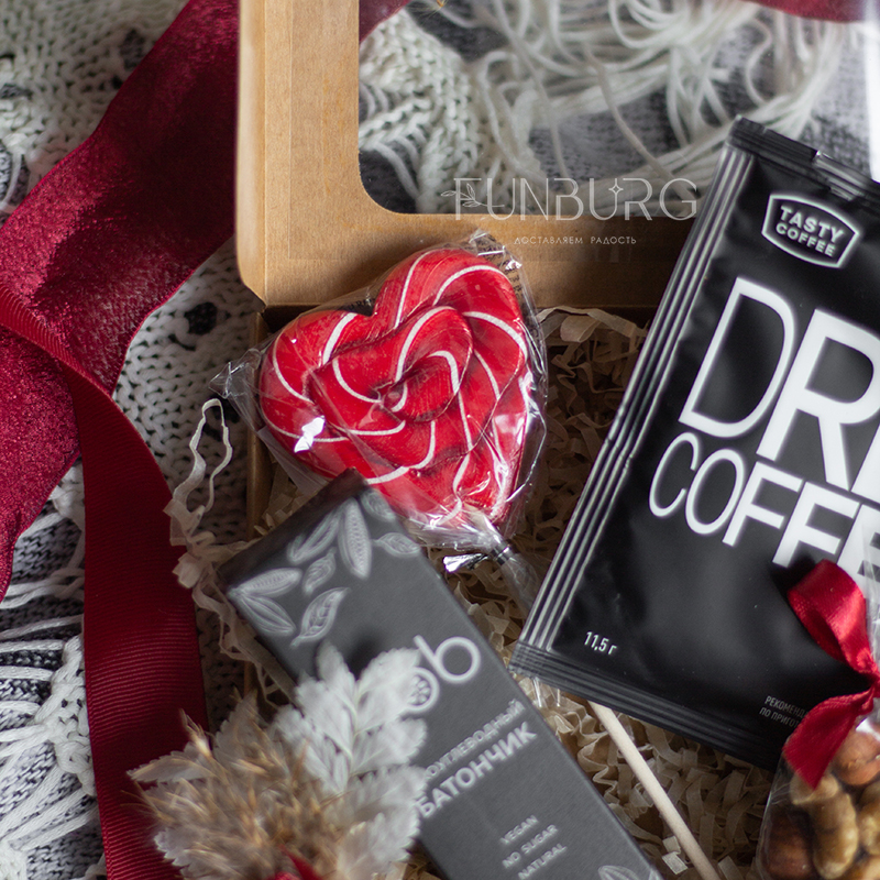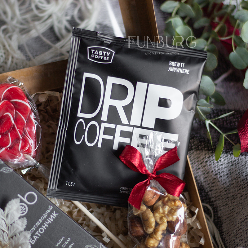 В этой небольшой коробочке есть все для самого приятного кофе-брейка! В наборе: кофе в дрип-пакете, который так легко заваривать, где бы вы ни находились, натуральный низкоуглеводный батончик (подходит даже веганам и не содержит рафинированный сахар), орешки, леденец-сердечко и букетик из сухоцветов для настроения. Идеально для маленького сюрприза любителю хорошего кофе и изысканных сладостей!