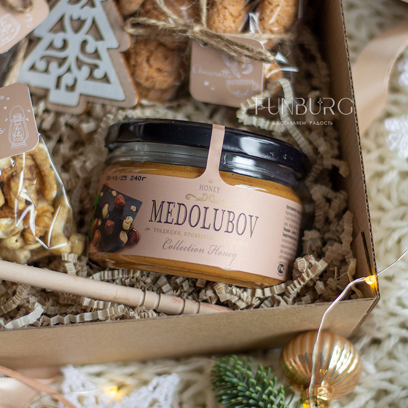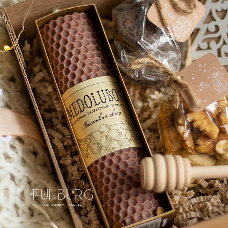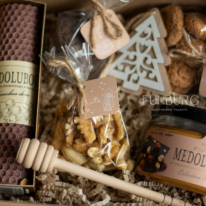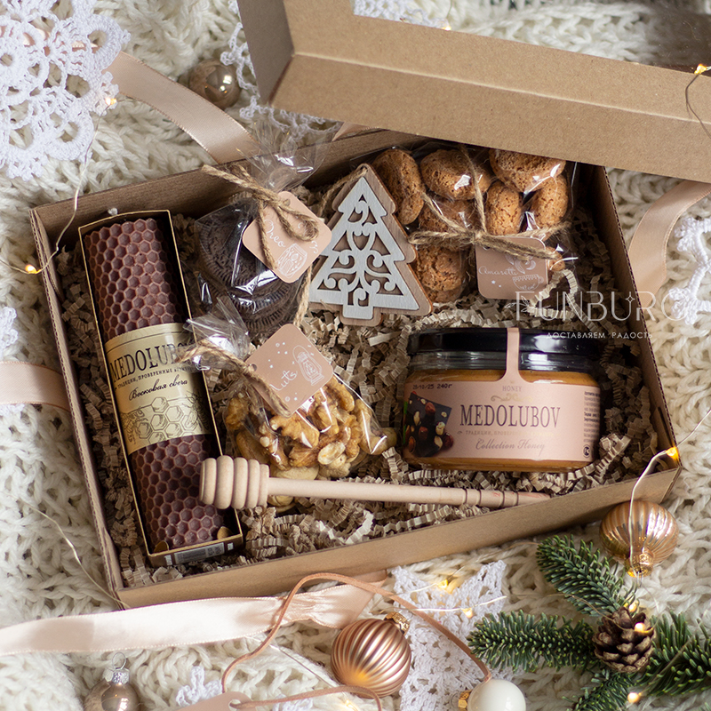 Очень уютный и теплый подарочный набор с нежным крем-мёдом, орешками, двумя видами печенья, елочной игрушкой, ложкой для мёда, и конечно, невероятной свечки с текстурой сот из настоящего пчелиного воска и нежным и сладким медовым ароматом! Идеально для зимних сюрпризов.