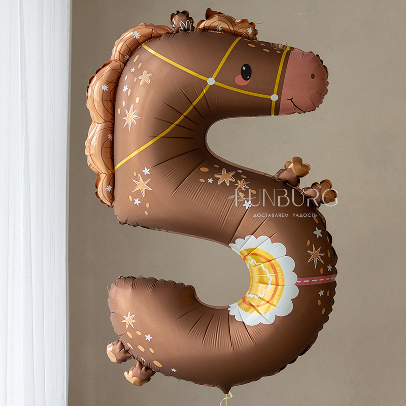 Красивая сатиновая цифра 5 в виде очаровательной лошадки идеально подойдет для празднования пятого дня рождения или пяти месяцев с рождения малыша.