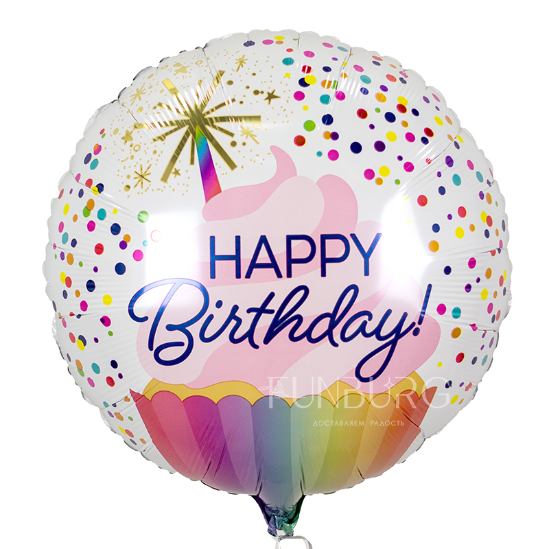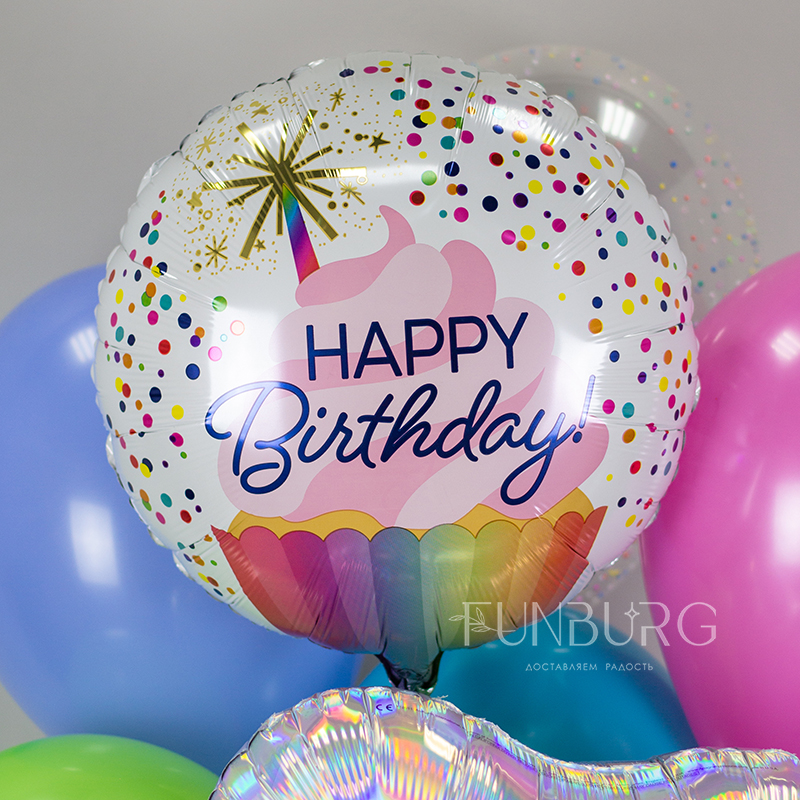 Шарик с красивым праздничным кексиком и поздравлением с днём рождения, идеально подойдет для дополнения подарка имениннику!