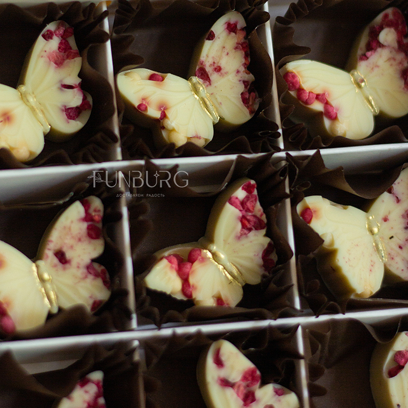 Набор безумно красивых (и, конечно, очень вкусных) конфет ручной работы из бельгийского белого шоколада в форме изящных бабочек, с добавлением сублимированной клубники и хрустящих рисовых шариков. Такой подарок очень приятно не только получить, но и дарить!