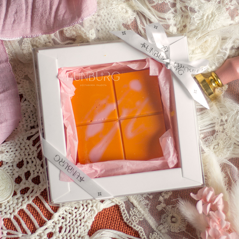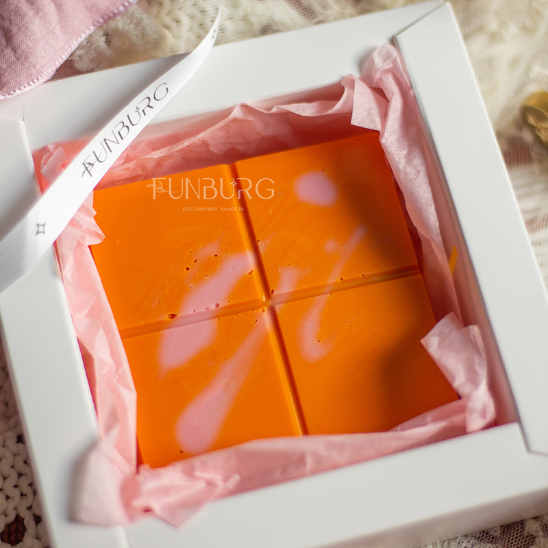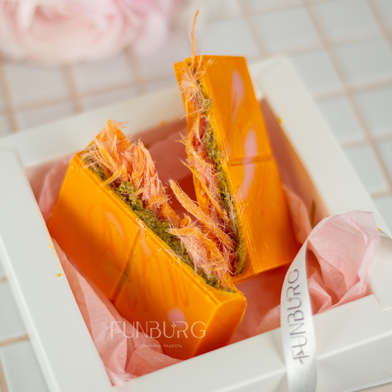 Соблазнительный апельсиновый бельгийский шоколад с нежнейшей воздушной начинкой с тающей текстурой из малинового пишмание (традиционный десерт Турции и Ирана из тончайших тающих нитей сладкого теста) и натуральной фисташковой пасты словно сладкие нежные объятия! Непохожие текстуры гармонично переплетаются, создавая незабываемый ни на что не похожий обволакивающий вихрь сладкой нежности в каждом кусочке! Это точно стоит попробовать!