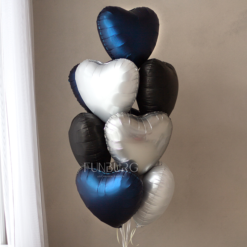 Небольшая гармоничная связка из сатиновых сердец насыщенного тёмно-синего, мерцающего белого, серебристого и сатинового чёрного, перевязанная для завершенности и особого шарма атласными лентами, отлично подойдет для подарка самым любимым и лаконичного украшения пространства для особенных случаев.