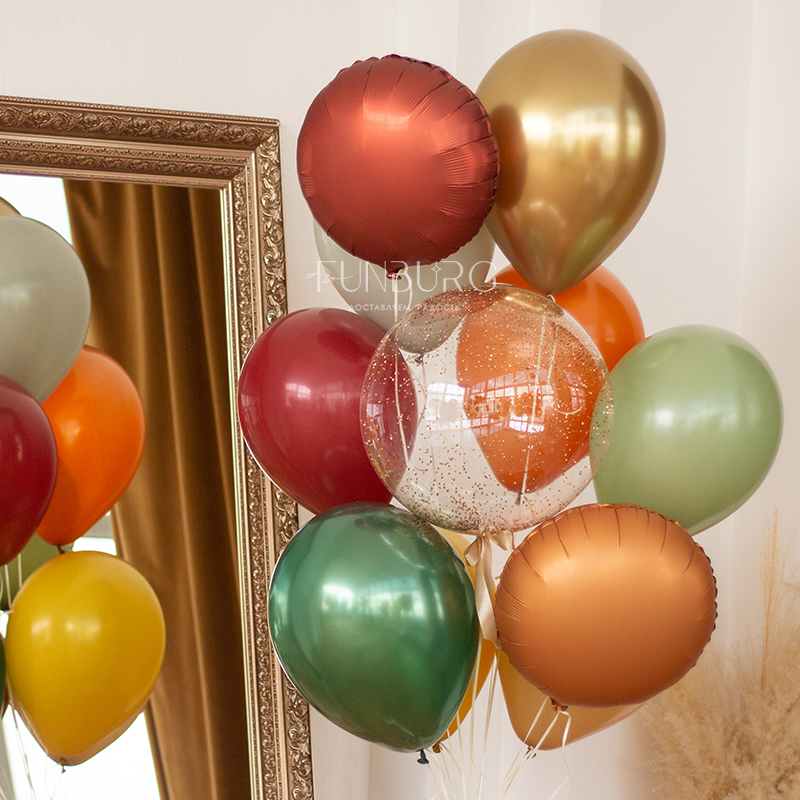 Красивая связка шариков в теплых согревающих цветах золотой осени! В ней мы собрали классические матовые и мерцающие шарики Chrome, сатиновые круги и Bubble со сверкающими конфетти, а для завершенности перевязали связку лентой. Идеально для теплых поздравлений и стильного украшения праздника.