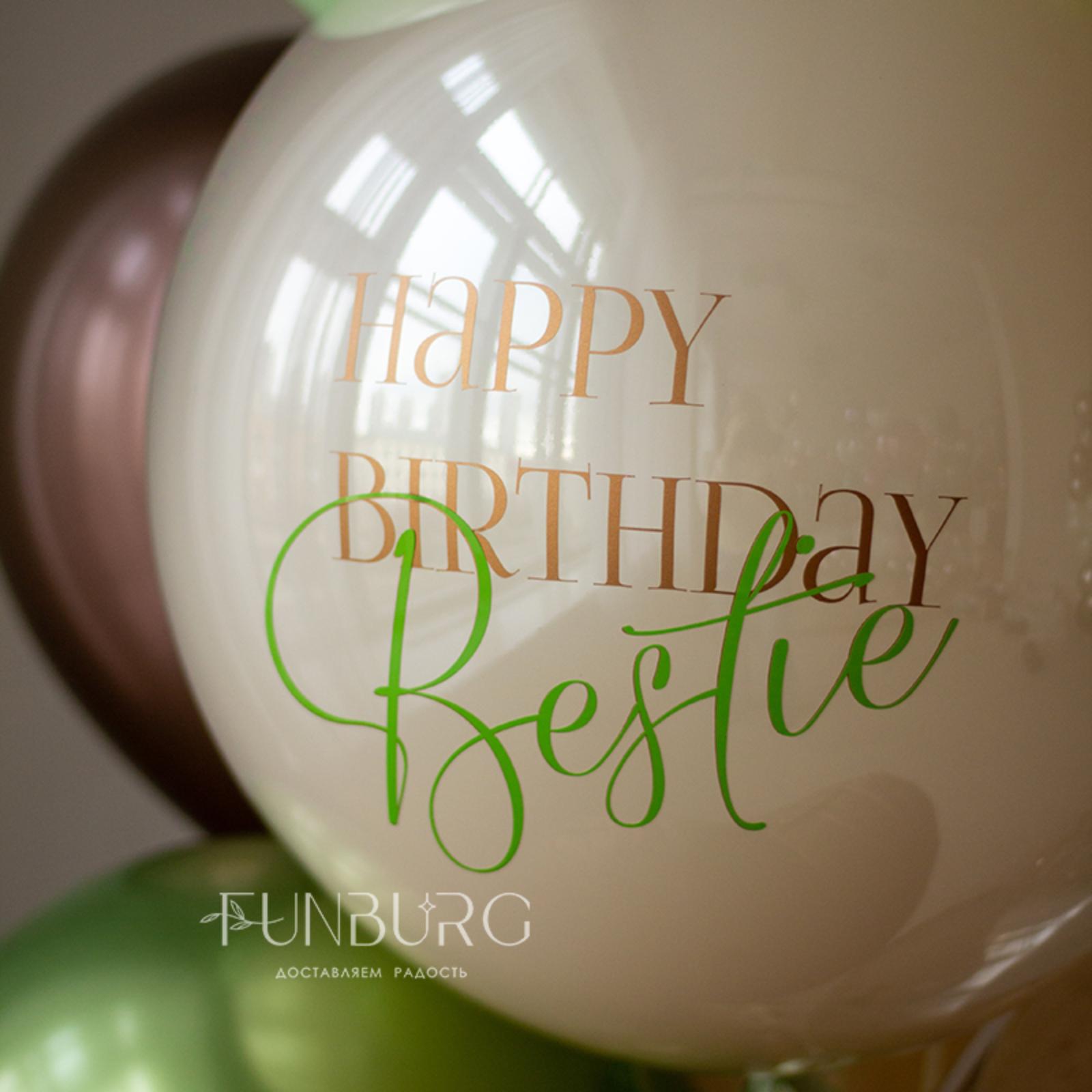 Стильная связка в уютных и модных и свежих оттенках фисташкового, шоколадного и кремового. Надпись на центральном стеклянном шаре можно сделать любой.