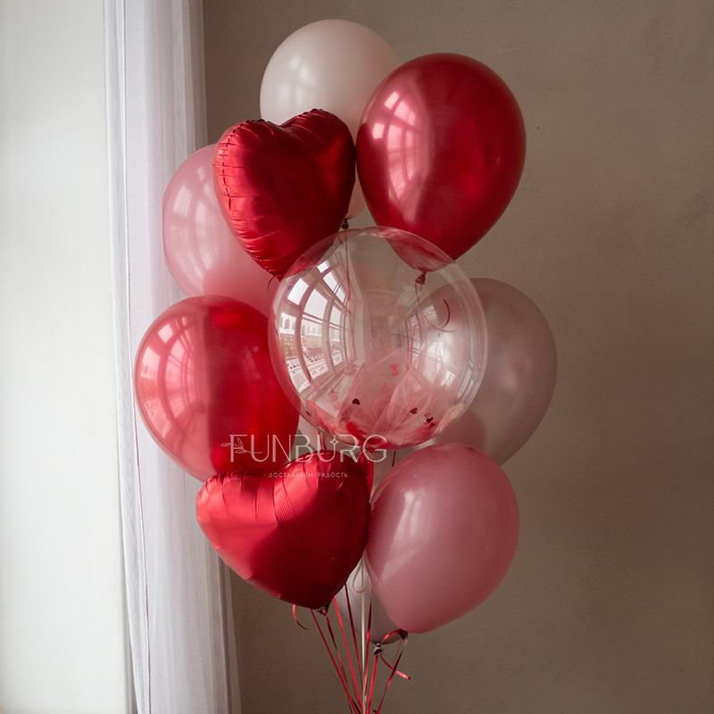 Красивая связка в ярких красных и нежных розовых оттенках, с шаром bubble с фатином, перьями и конфетти, красными сатиновыми сердечками, матовыми и сияющими шариками. Для самых красивых и нежных поздравлений и признаний.