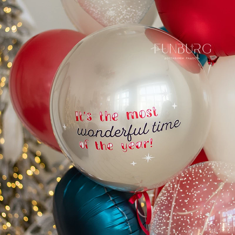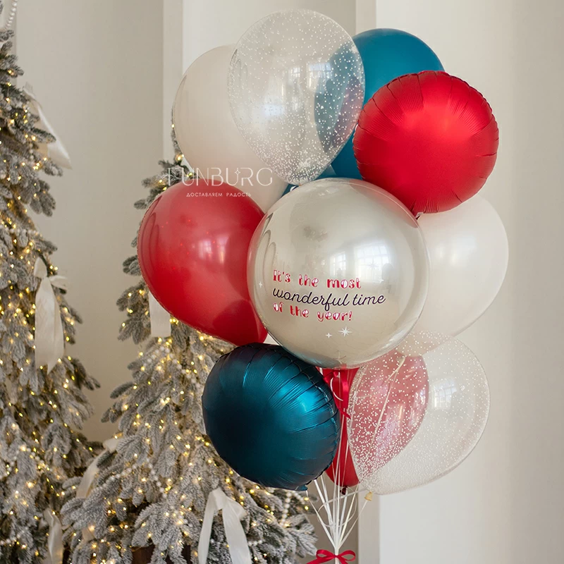 Волшебная связка шариков необычных праздничных оттенков, с красивым стеклянным шаром с нежным жемчужным мерцанием и красивой надписью (ее можно сделать любой), словно присыпанной первым снегом, шариками с белым конфетти-снежинками и сатиновыми кругами, похожими на елочные шарики. Идеальное украшение всех зимних праздников!